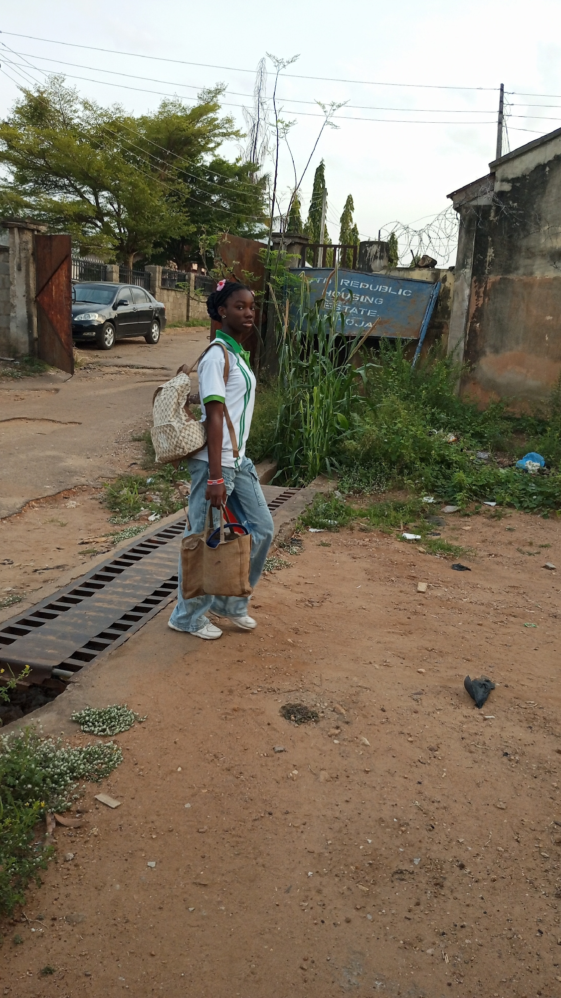 A young woman stands on a dirt road in Adankolo, Nigeria. She wears a white t-shirt with green trim, light-wash jeans, and white sneakers. A backpack is slung over her left shoulder, and she carries a tan tote bag in her left hand. To her left is a storm drain, and a black car is parked beyond an open gate. Behind her is a concrete wall topped with barbed wire. A sign partially obscured by vegetation reads "South Republic Housing Estate, Oja." Trash is scattered on the ground. | Open Wire