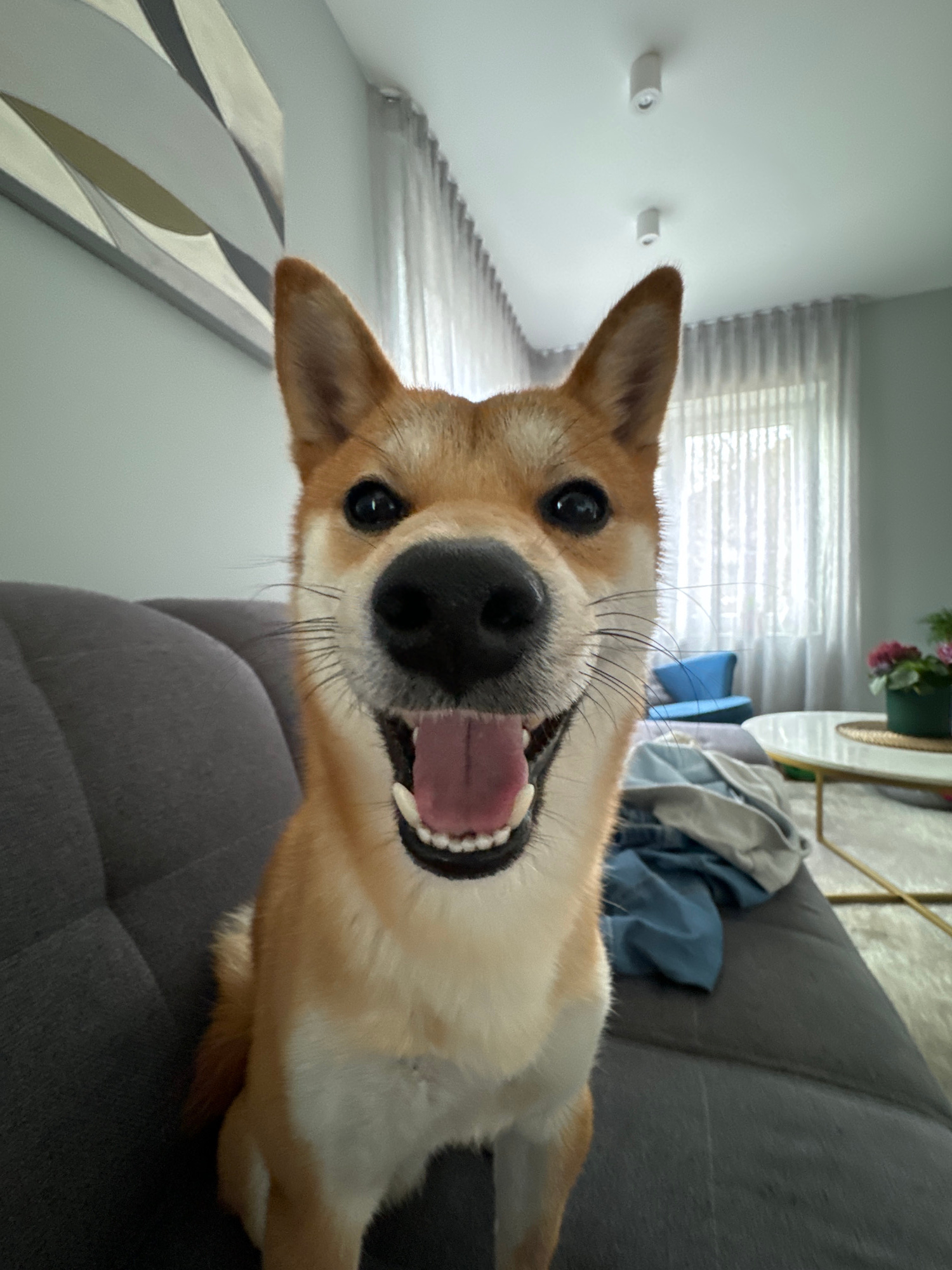 A close-up, distorted image captures a Shiba Inu dog lying on a gray upholstered sofa, likely indoors. The dog is mid-action, with its mouth open and pink tongue visible. The dog's teeth are also visi…read more