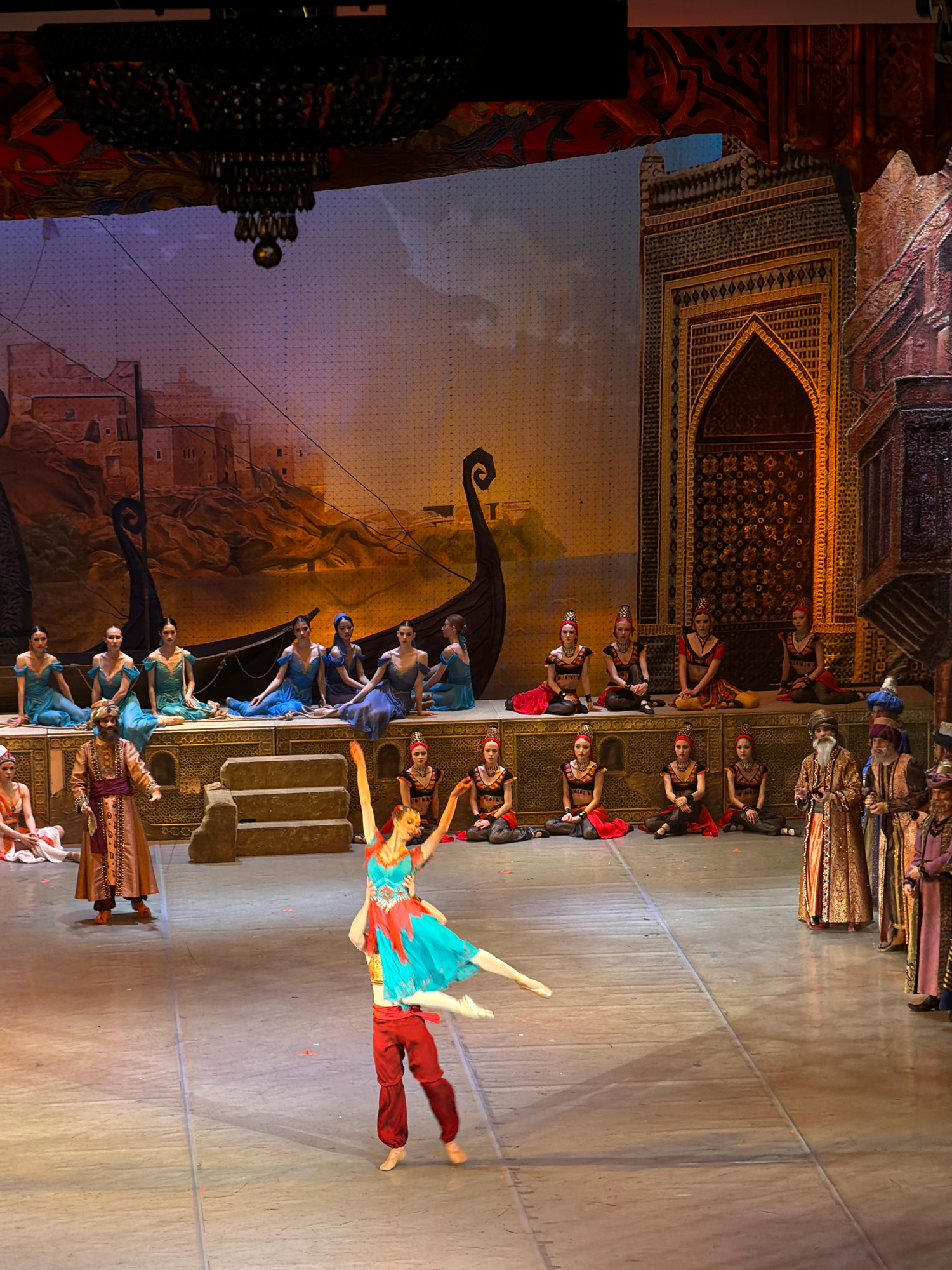 A stage performance is taking place in Izhevsk, Russia. Dancers are performing on a stage with a painted backdrop depicting a city with boats. A male and a female dancer, both wearing costumes, are in…read more