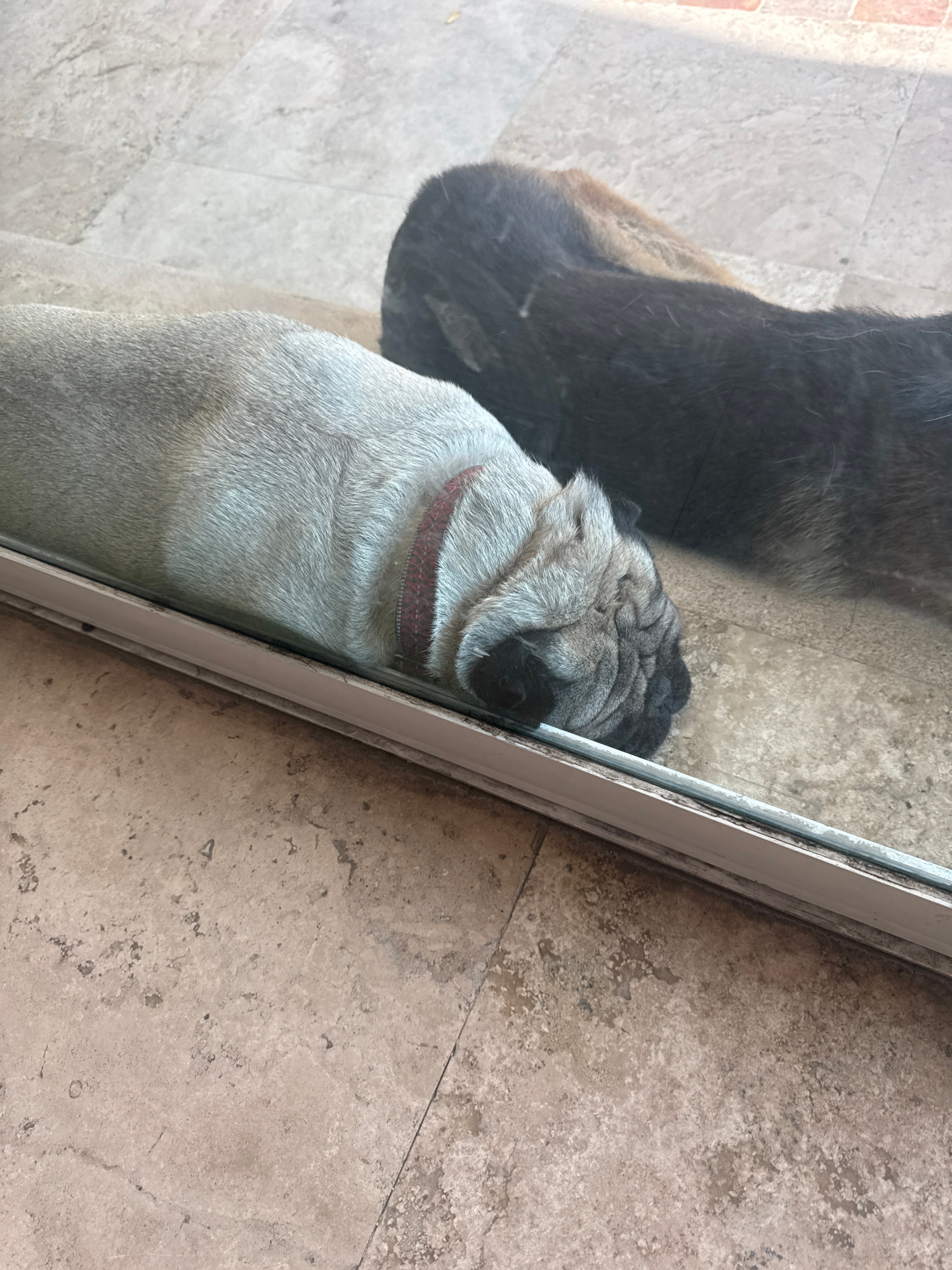 A pug, presumably domestic, with gray fur, black facial features, and a red collar, rests its head against the base of a window frame. The dog is positioned inside a building, as the interior is visib…read more