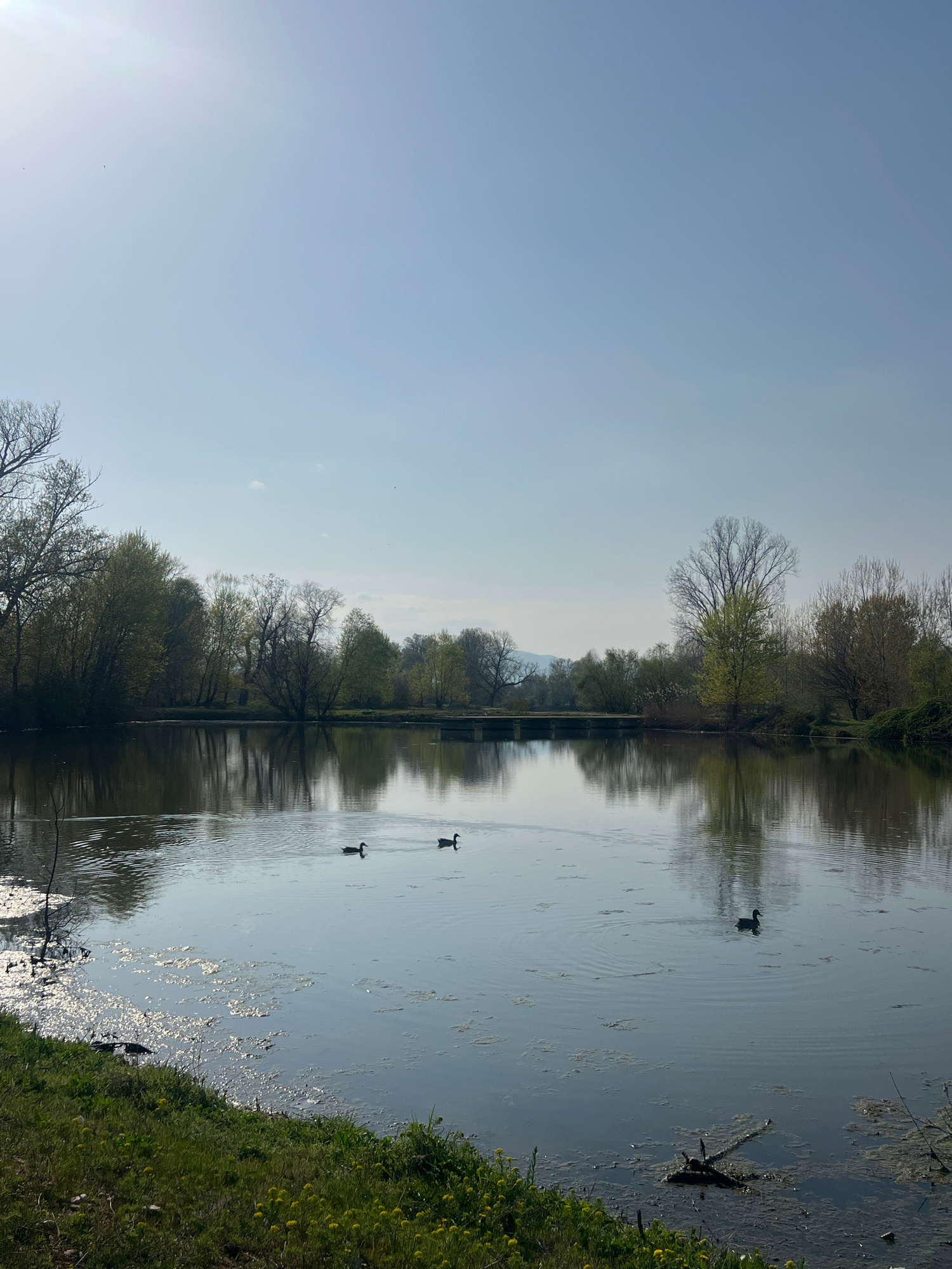 The image shows a body of water with trees lining one side, and grass and yellow flowers on the opposite side. There are three birds swimming in the water. The sky is light blue. The location is likel…read more