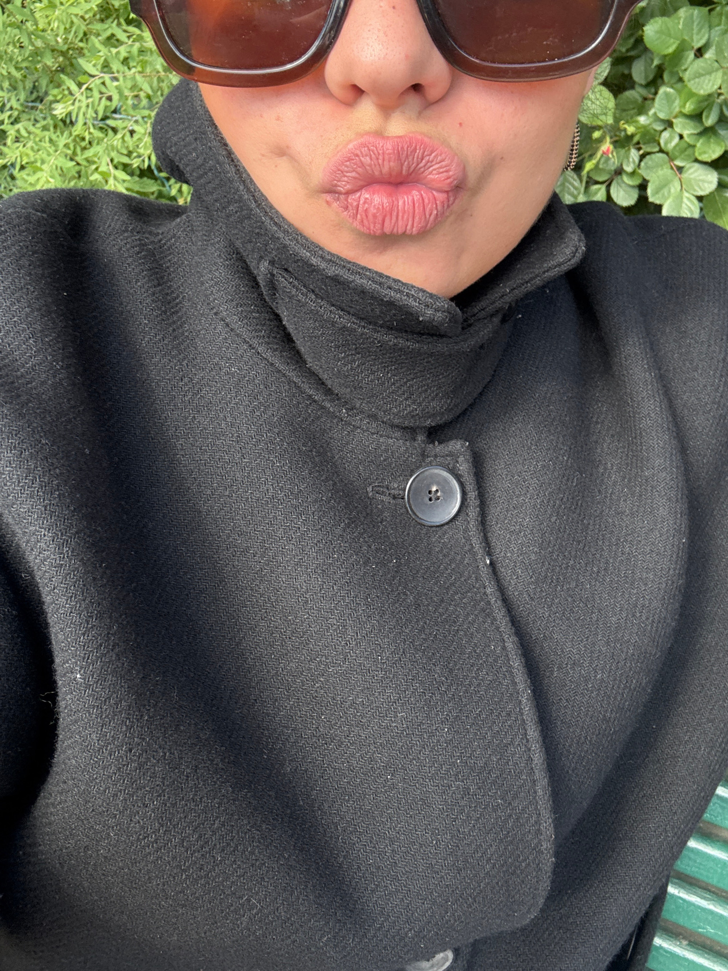 A person with brown sunglasses, and exaggeratedly pursed lips, lies down in a black coat, outdoors on a bench in Paris, France, as inferred from the proximity of the bench to some shrubs or grass. The…read more