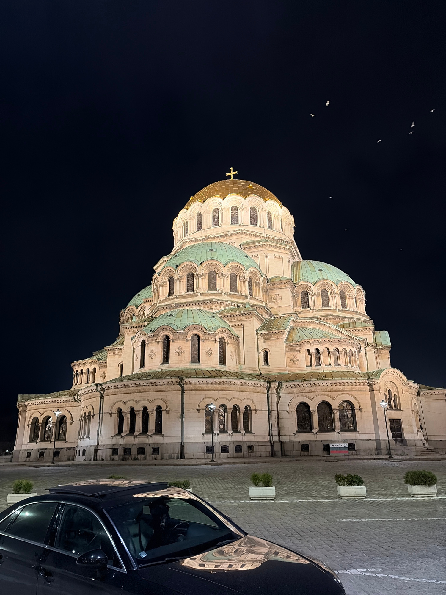 The image shows the Alexander Nevsky Cathedral in Sofia, Bulgaria at night. The cathedral is brightly lit, showcasing its architecture, including its domes, arches, and windows. A dark-colored car is…read more