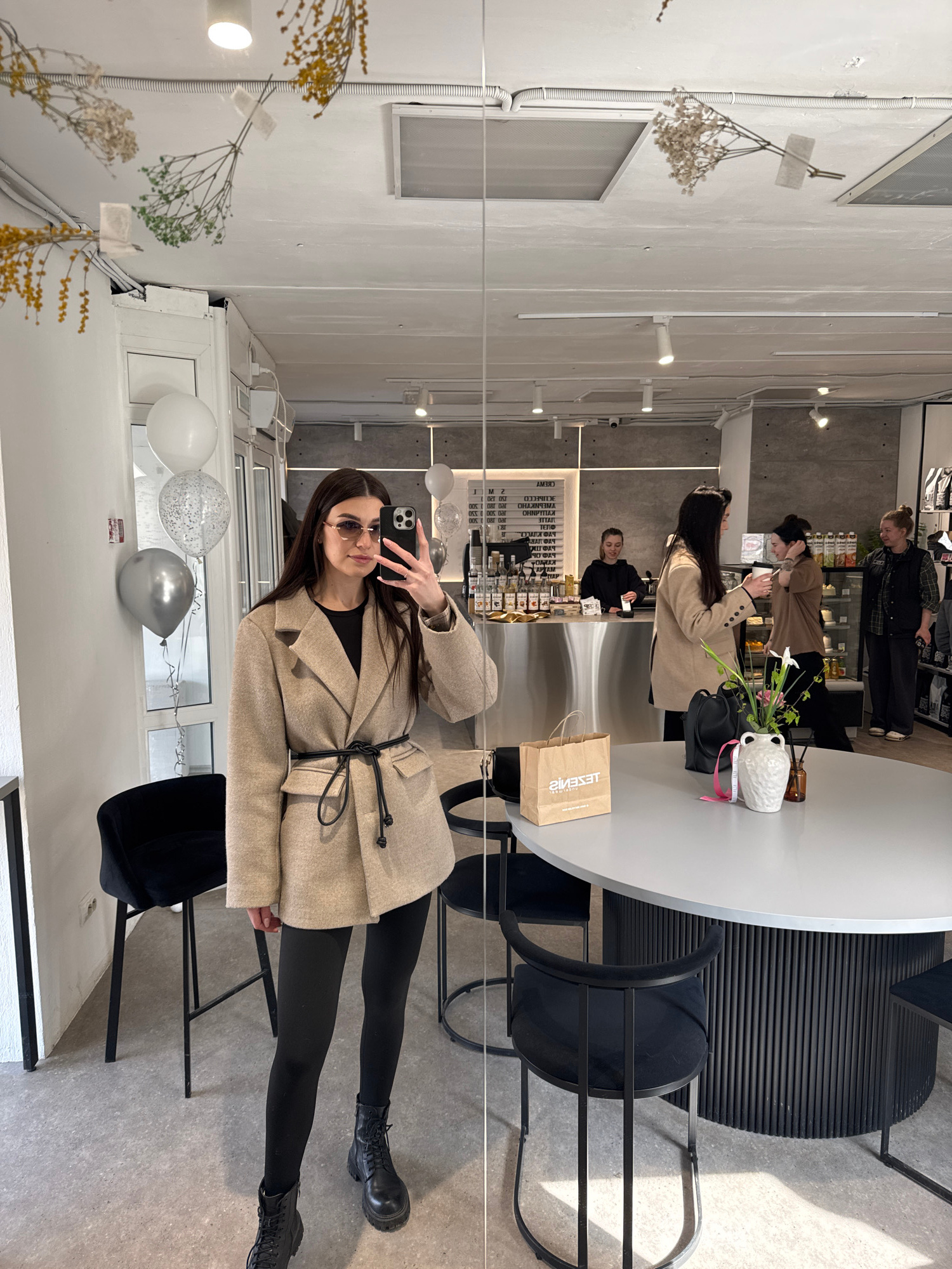 The image shows a woman taking a selfie in a restaurant. She is wearing a beige coat, black leggings, and black boots. She is holding a phone in her right hand. In the background, there are other peop…read more