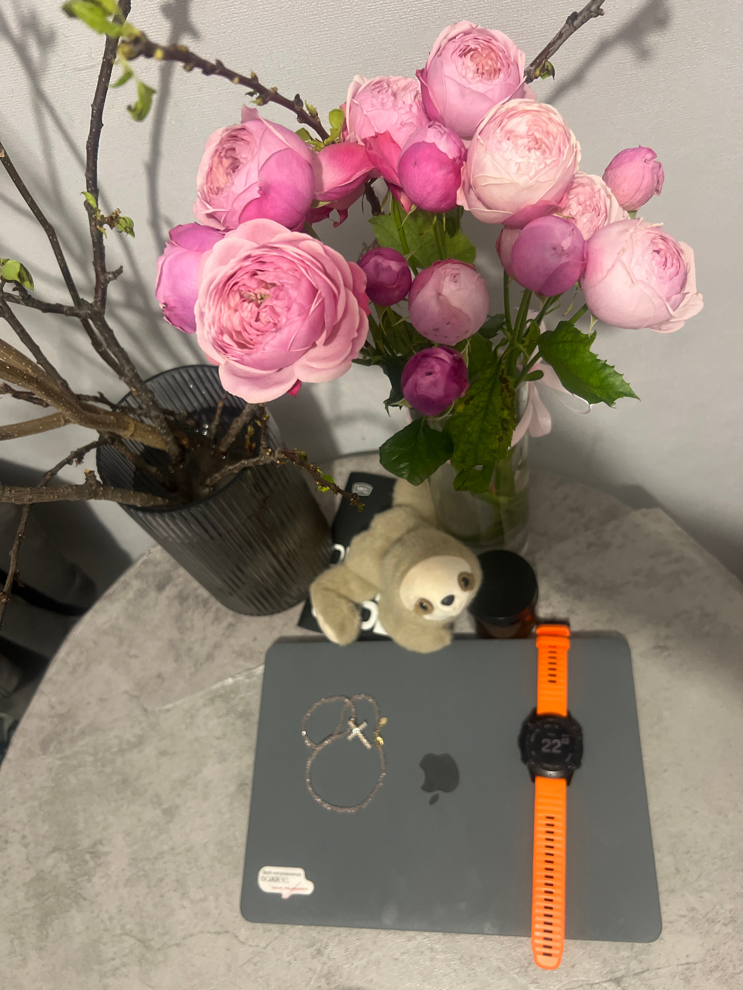 The image depicts a still life arrangement on a gray, marble-patterned surface. A bouquet of pink roses in a dark, fluted vase occupies the left side of the image. To the right of the vase is a gray l…read more