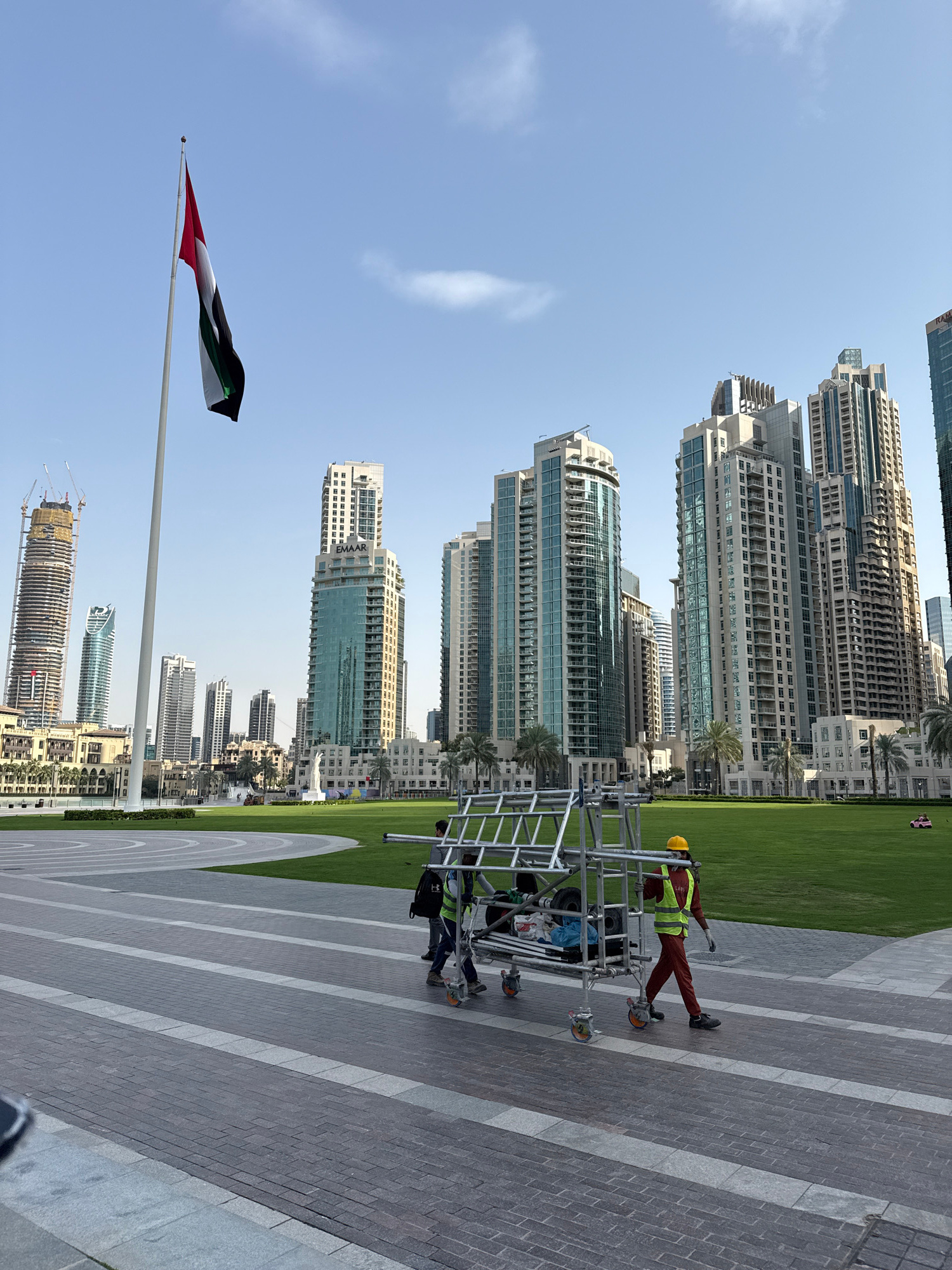 This photograph captures a vibrant urban scene in Dubai, United Arab Emirates, under a bright, clear sky. The image features a mix of modern architecture, green spaces, and active construction or mainβ¦read more