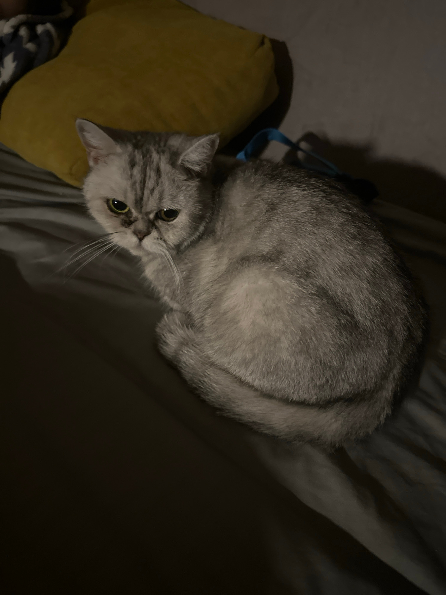A silver tabby cat is curled up on a gray blanket. The cat's head is angled to the left, and it's looking towards the camera with its green eyes. A yellow pillow is to the left of the cat, and a blue…read more