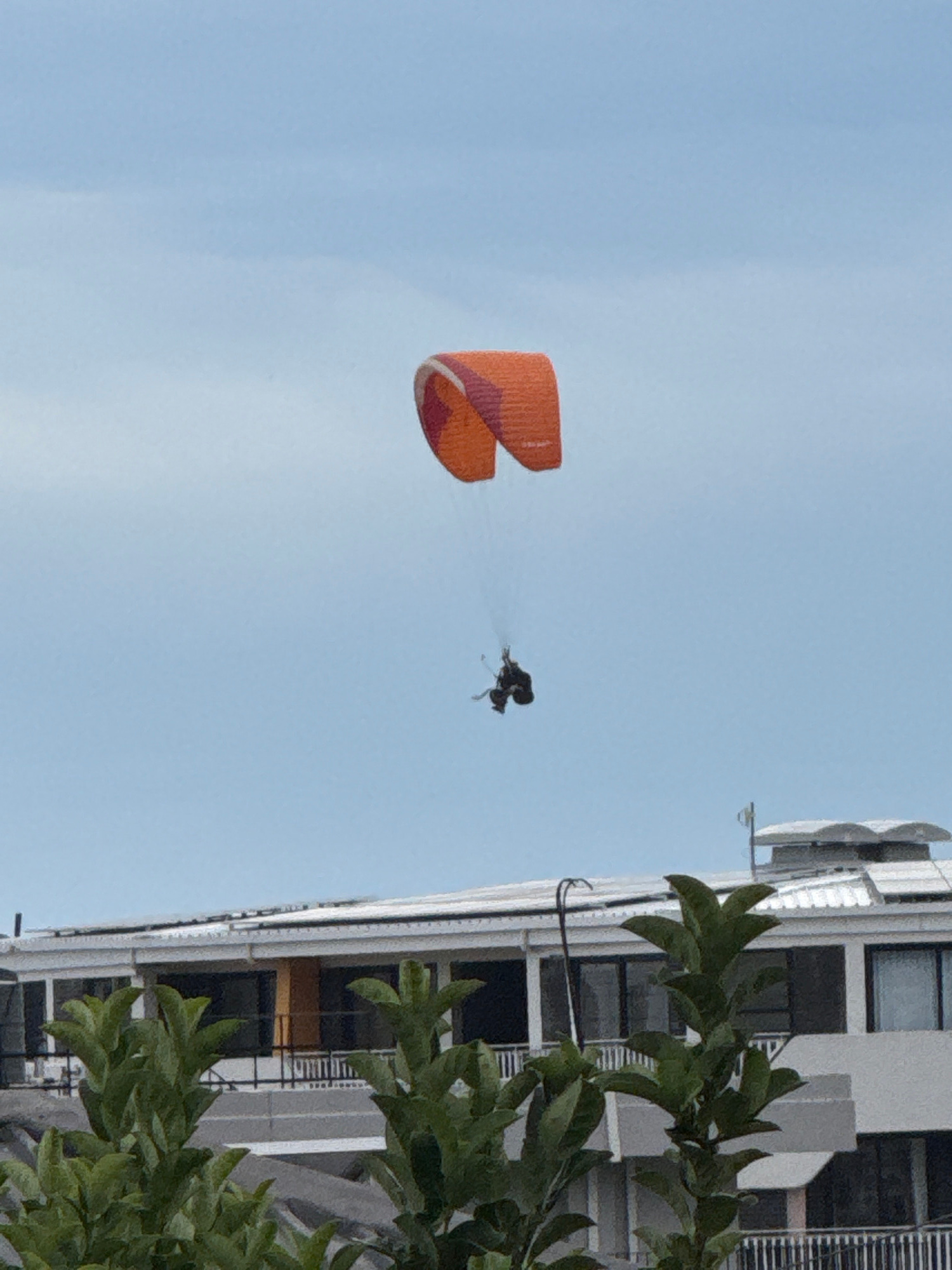 The image shows a paraglider with two people flying in the sky. The paraglider is orange and red. A building is visible on the right side of the frame, partially obscured by leaves. The sky is light b…read more