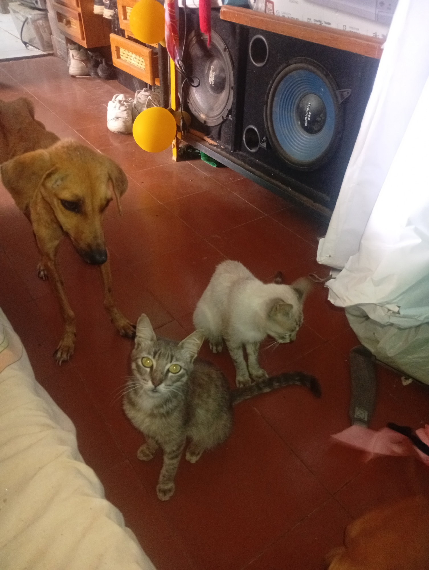 This image captures an indoor scene within a residence in Altagracia, Venezuela. The foreground features a reddish-brown tiled floor. Dominating the mid-ground are three domestic animals: a light brow…read more