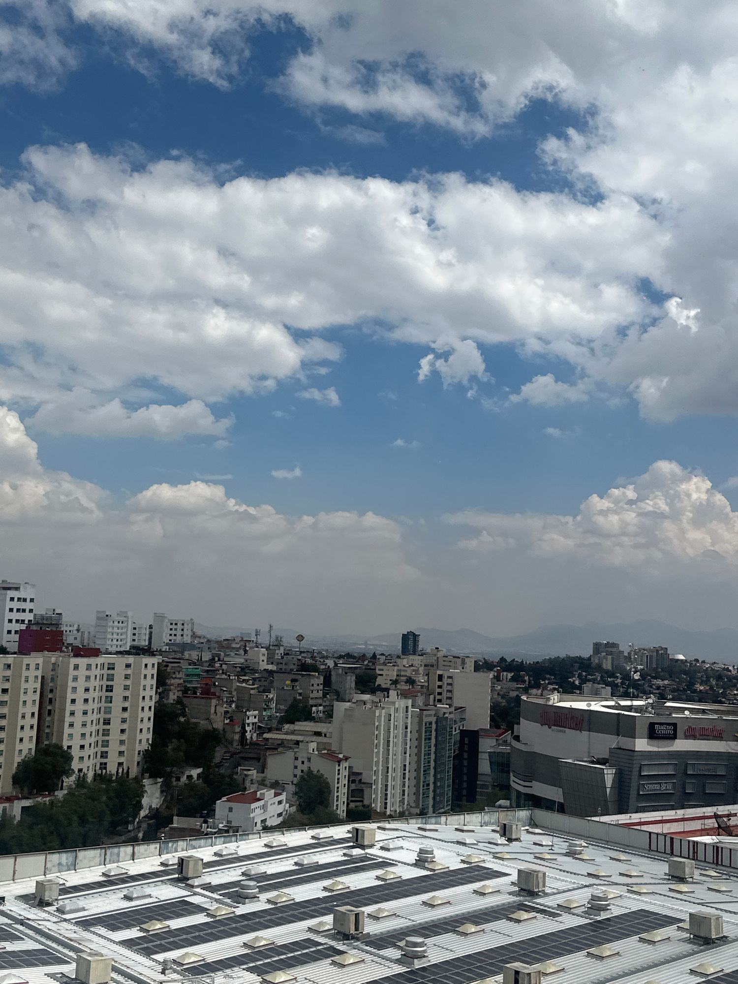The image depicts an aerial view of Huixquilucan de Degollado, Mexico, with the sky occupying the left half of the frame filled with cumulus clouds and blue sky. The city sprawls across the right half…read more