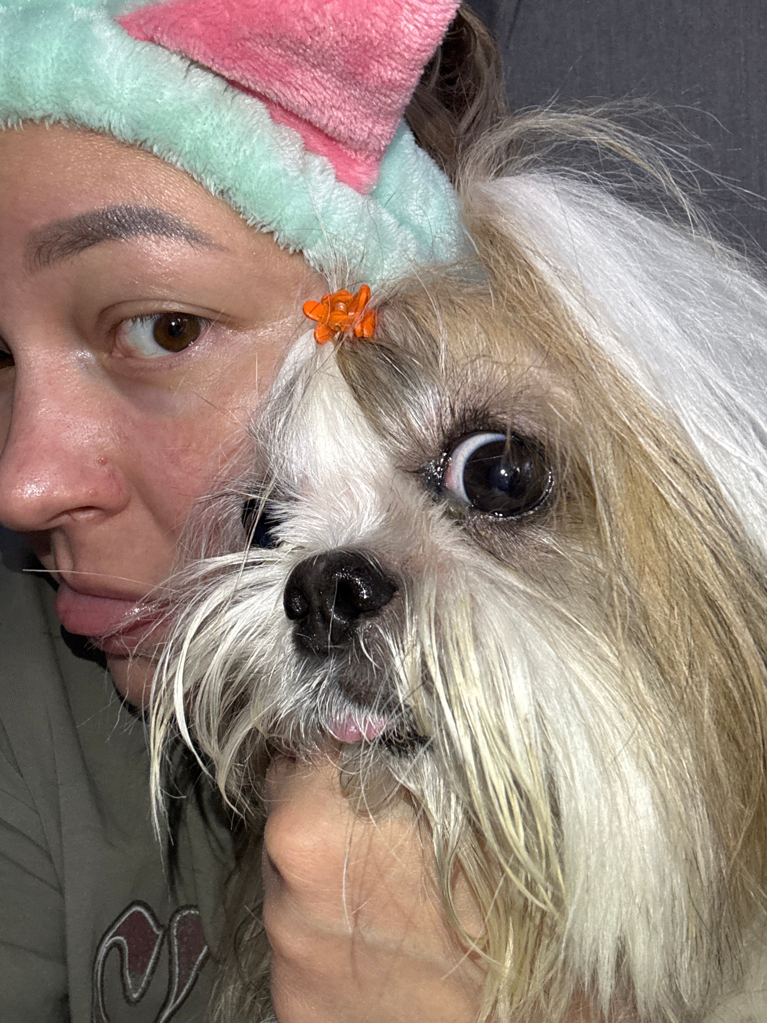 A close-up, angled shot features a person and a dog, likely indoors. The person is wearing a pink and light green head covering with a small orange flower clip. The person's left eye, nose, and mouth…read more