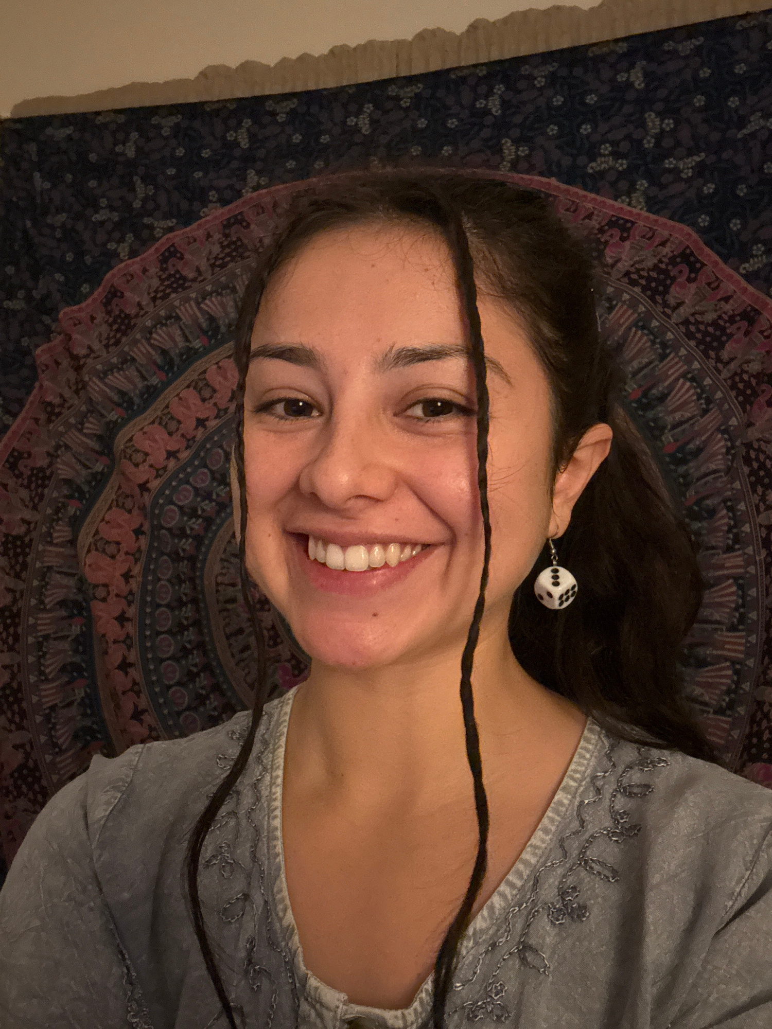 A young woman with dark hair and a radiant smile is captured in a close-up, rotated portrait. Her head is tilted, and she looks directly at the camera with a bright, friendly expression, showing her t…read more