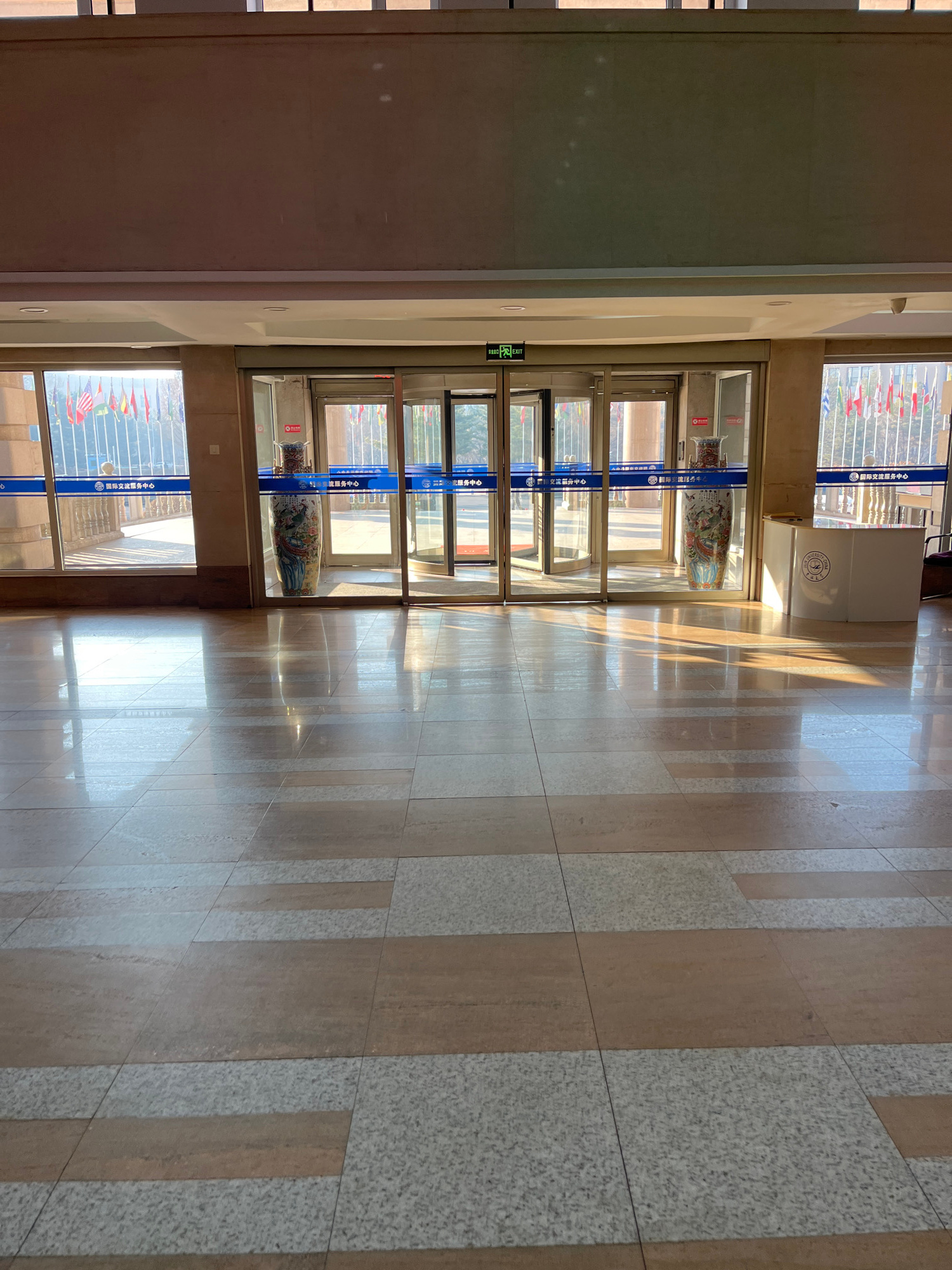 The image shows a hallway with a series of glass doors on the left side. The doors have blue vertical stripes and feature a logo that reads "国际交流服务中心" which translates to "International Exchange Servi…read more