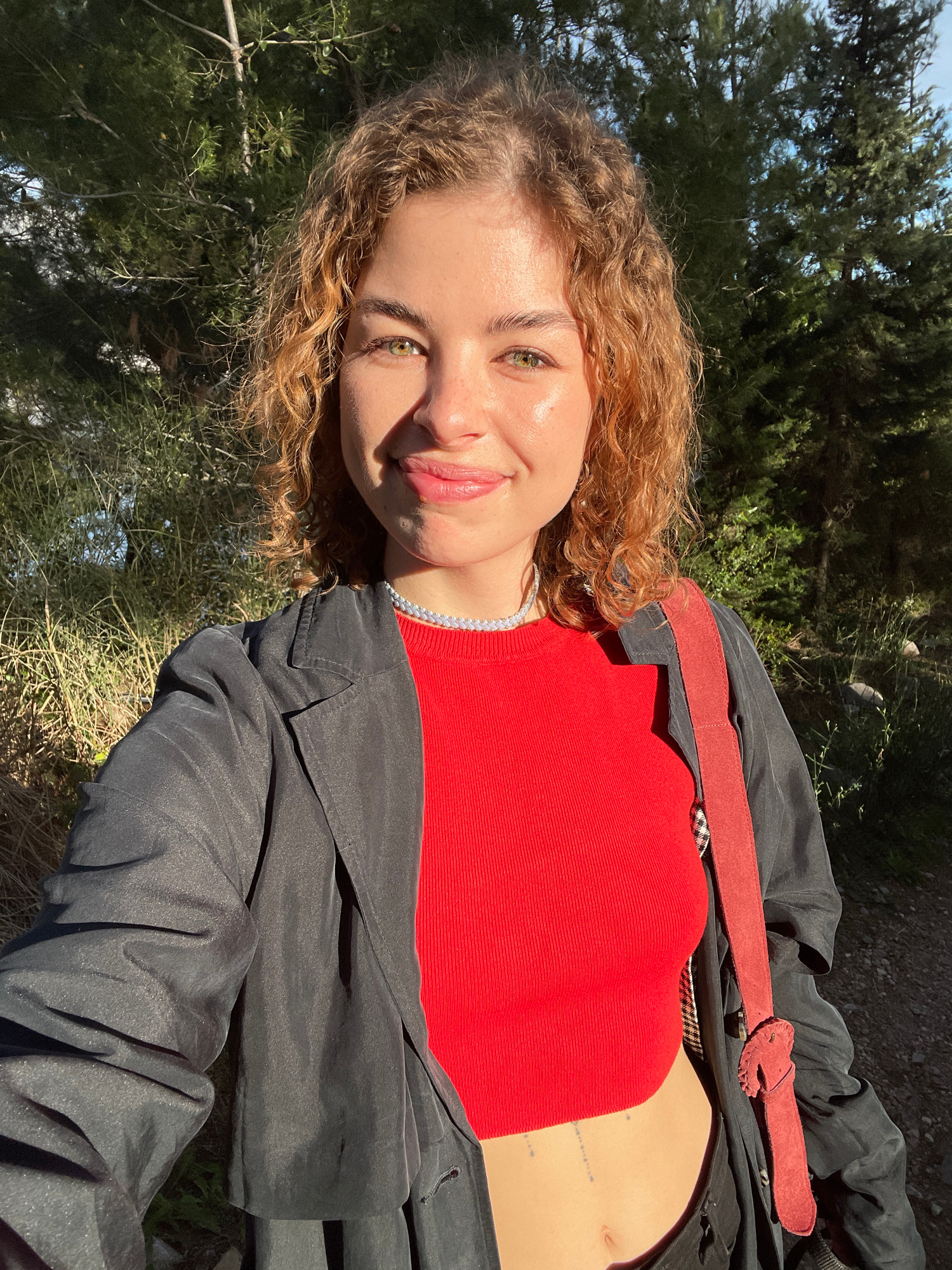 A person with curly, light-brown hair and fair skin is depicted outdoors in a close-up shot. They are wearing a red, ribbed top and a dark, shiny coat with a red belt. The person is looking at the cam…read more