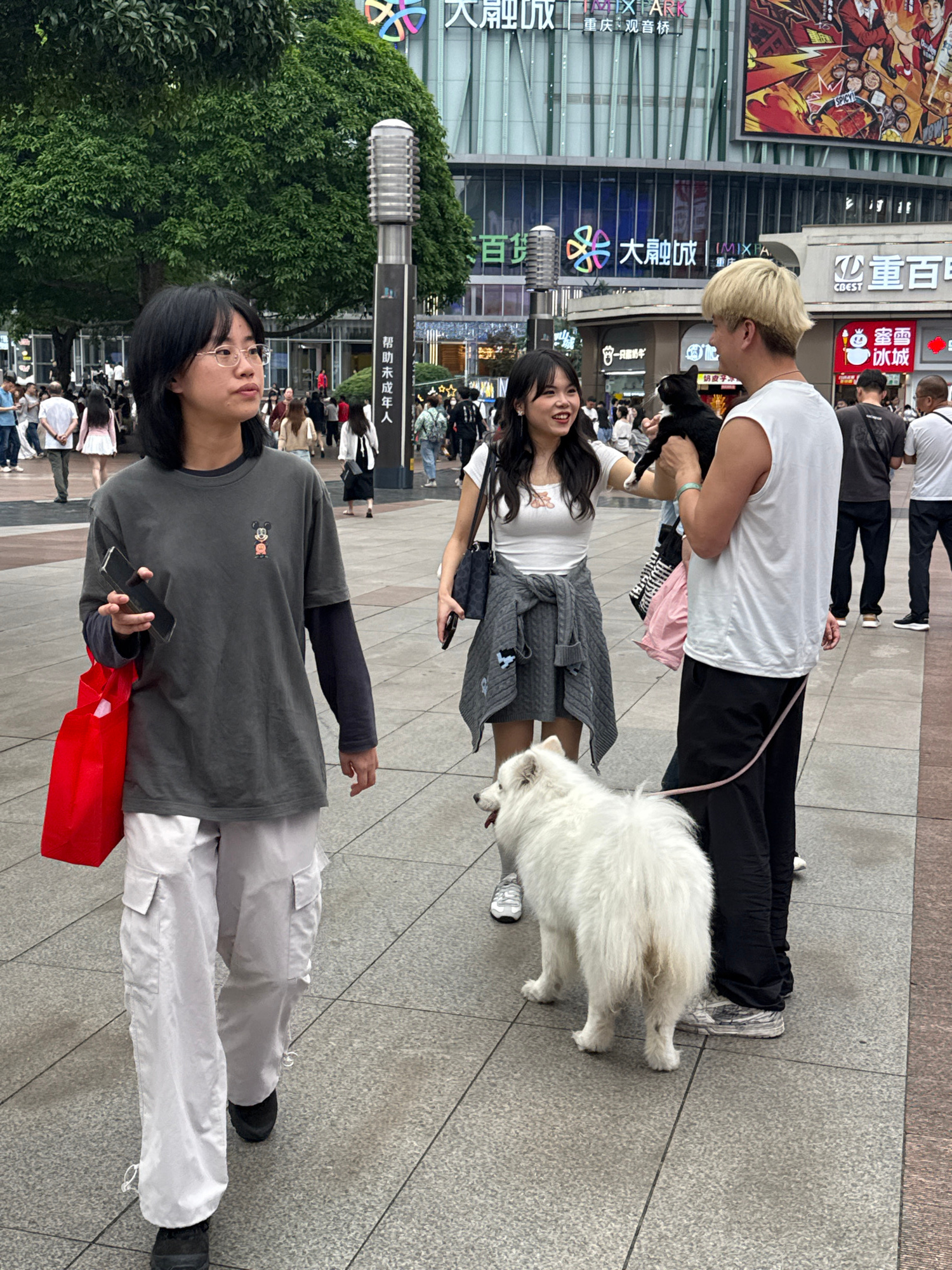 The image shows a bustling urban scene in the Liangjiang New Area of Chongqing, China. Two people are walking with their dogs. A woman with long, dark hair is smiling while holding a black cat and wal…read more