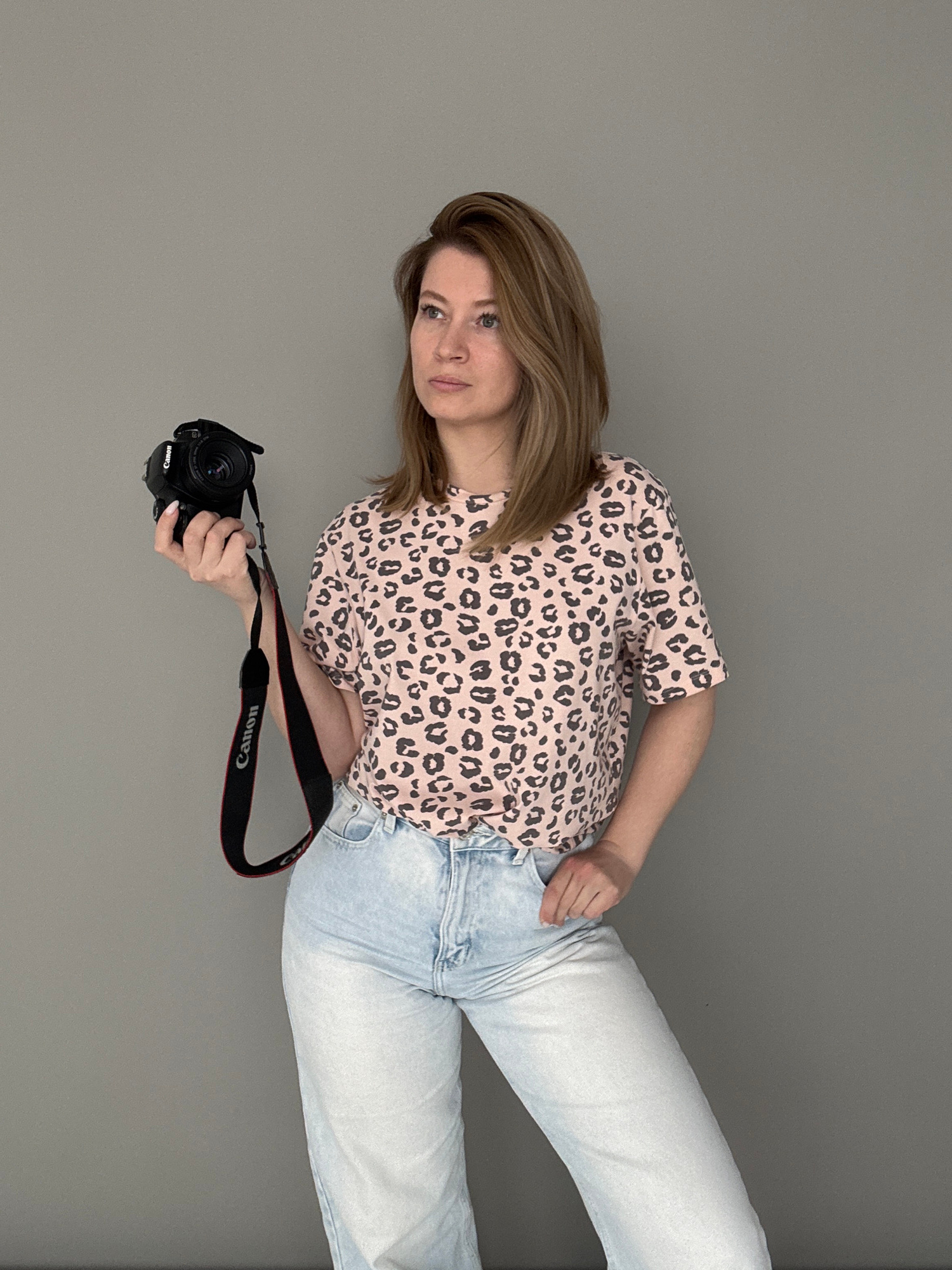 A woman with shoulder-length brown hair and light blue jeans stands against a gray background, holding a Canon camera with a black strap in her left hand. She wears a pink and black leopard-print shir…read more