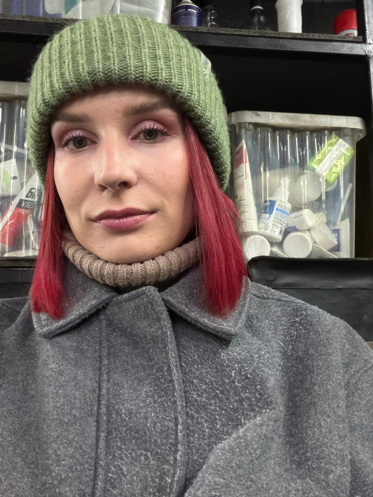 A close-up portrait features a young individual, likely female, with pale skin, reddish-pink hair, and a calm, slightly smiling expression. She looks directly at the camera, her eyes highlighted with…read more