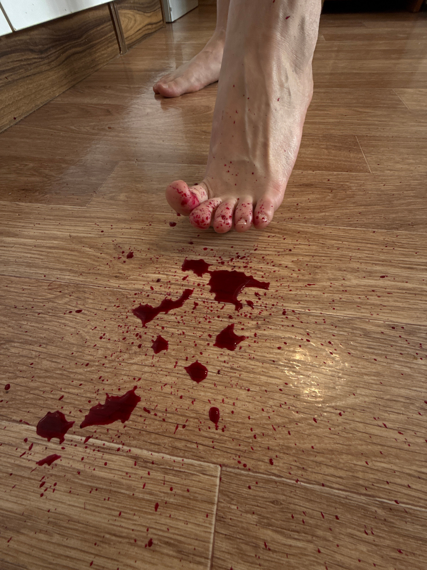 A foot is positioned on a wood-look floor with several splashes and droplets of red liquid, resembling blood, spread across the surface. The toes of the foot are also covered with the red liquid. The…read more