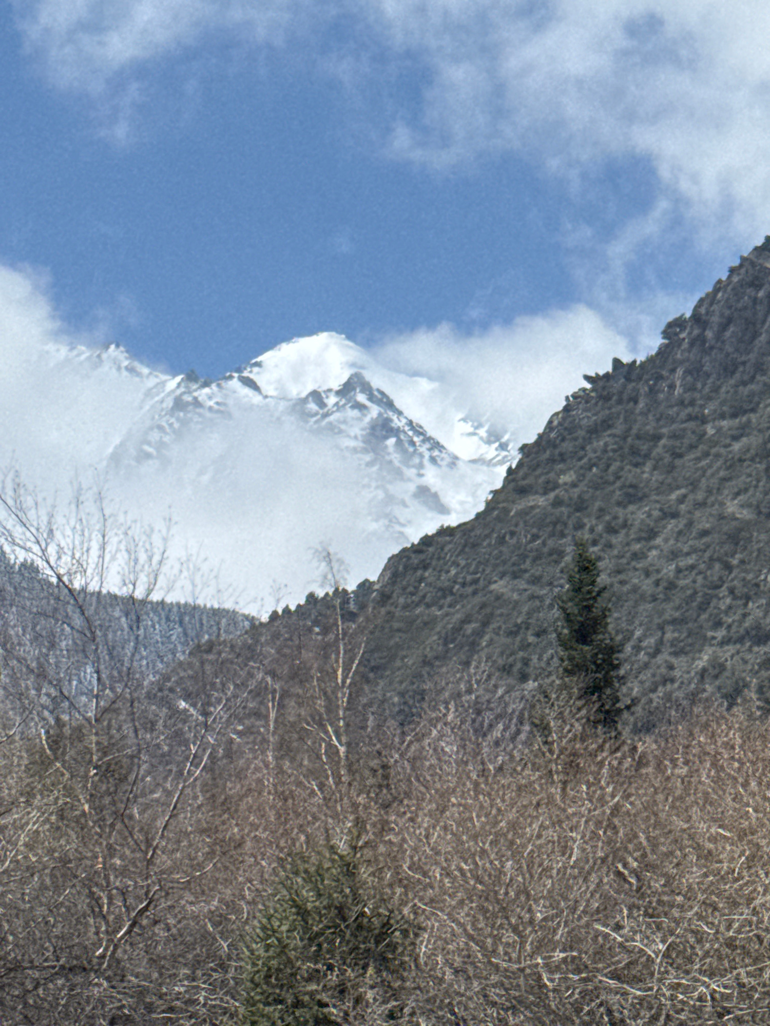 The image shows a snow-covered mountain peak under a blue sky with some clouds, situated adjacent to a rocky, forested hillside. The location is Kashka Suu, Kyrgyzstan. The hillside features barren tr…read more