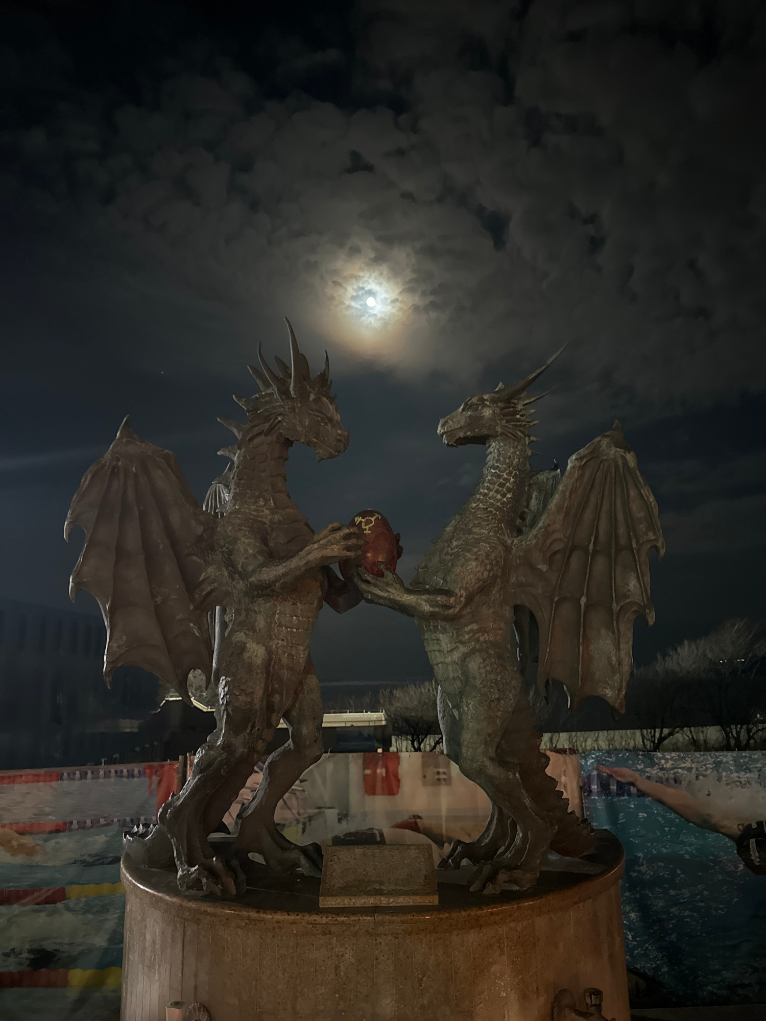 Two bronze dragon sculptures are positioned atop a cylindrical plinth, viewed at night against a backdrop of a cloudy sky illuminated by the moon. The upper dragon sculpture faces left, while the lowe…read more