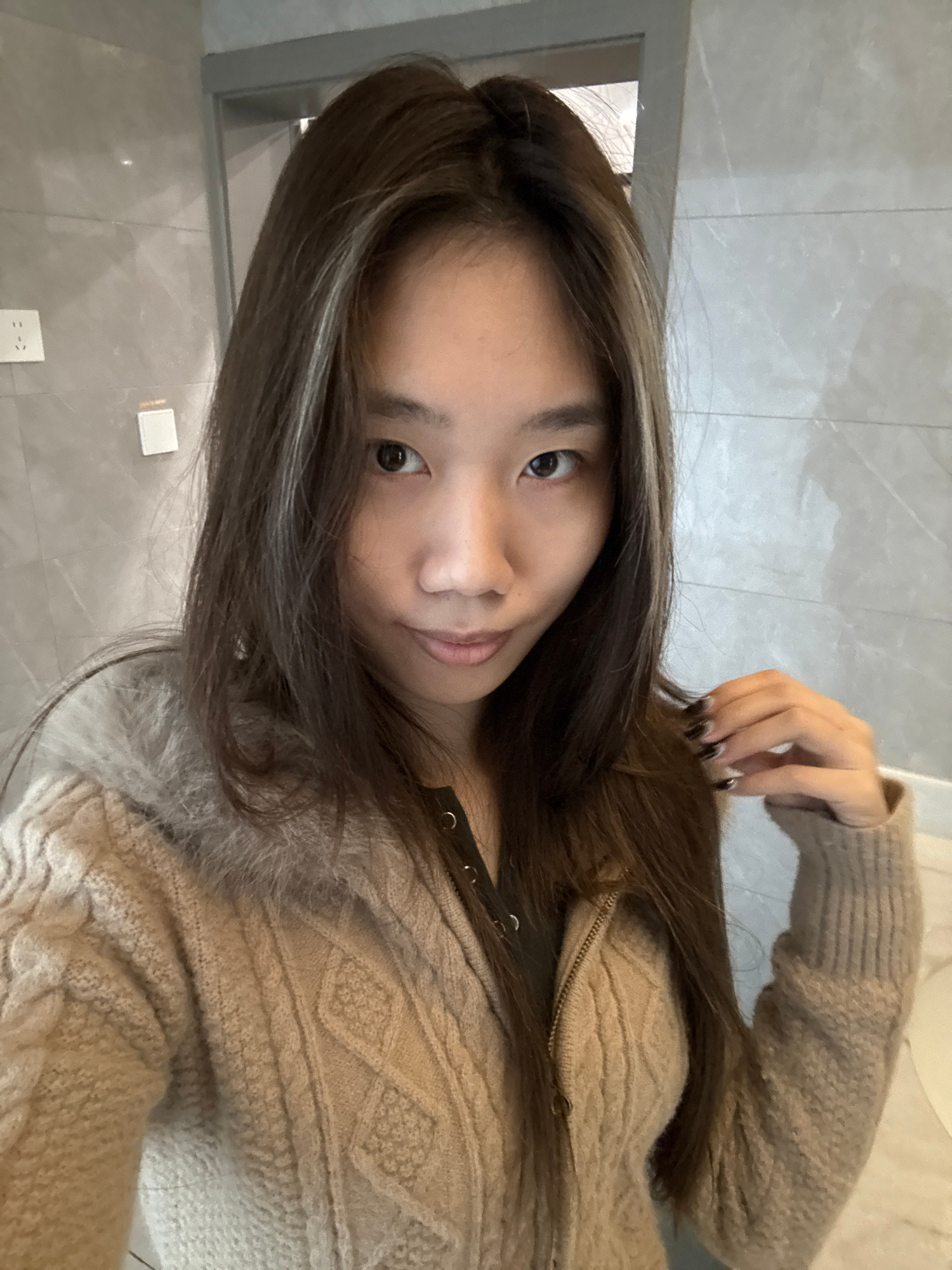A young Asian woman with long, dark brown hair and lighter highlights poses for a selfie. She is wearing a light brown cable-knit sweater with a fur collar. Her left hand is raised, fingers touching h…read more