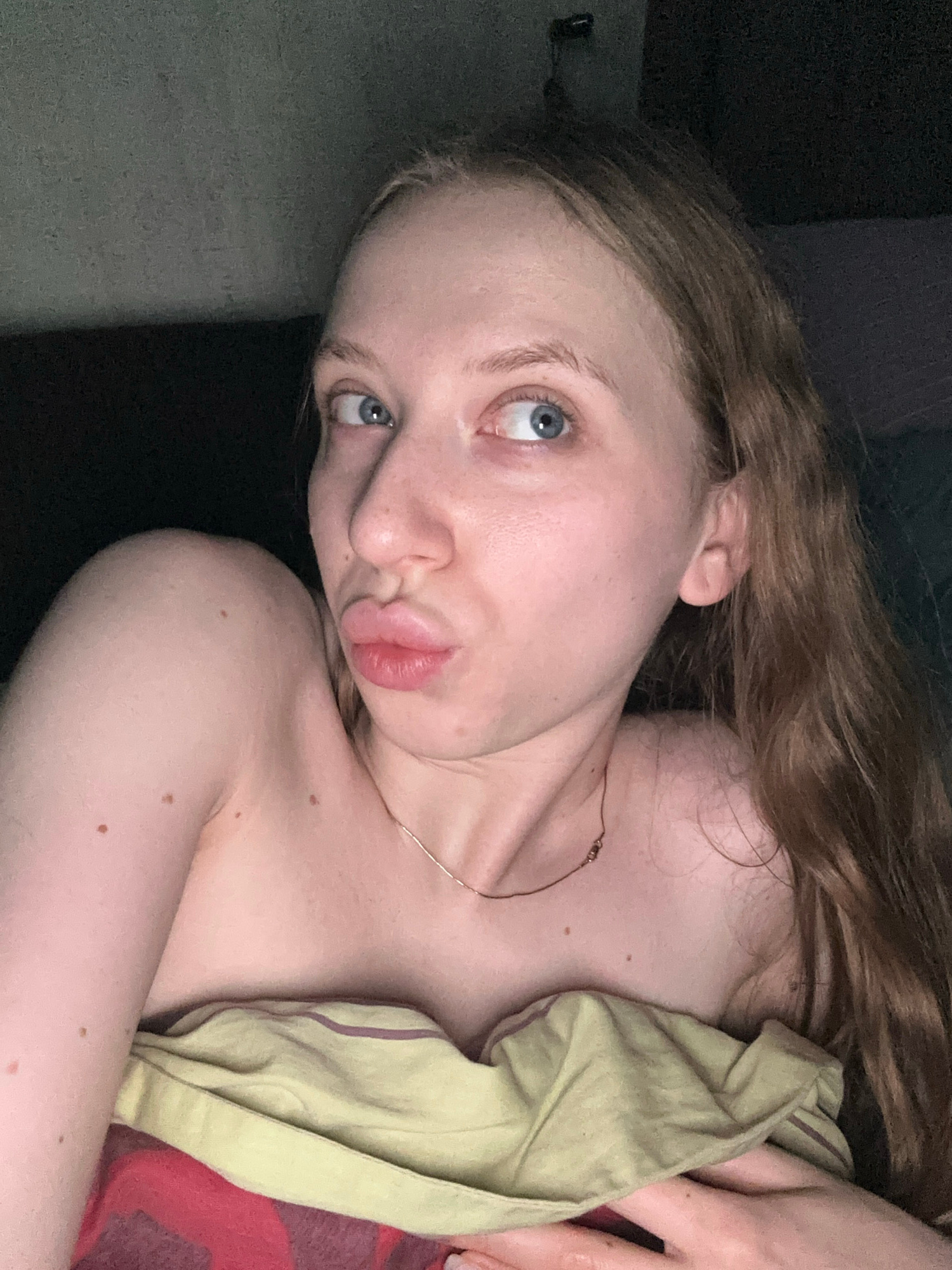 A young woman is depicted in a close-up, horizontal orientation, lying down indoors, likely in a bedroom in Chaikovsky, Russia. She has long, wavy reddish-brown hair that cascades around her head. Her…read more