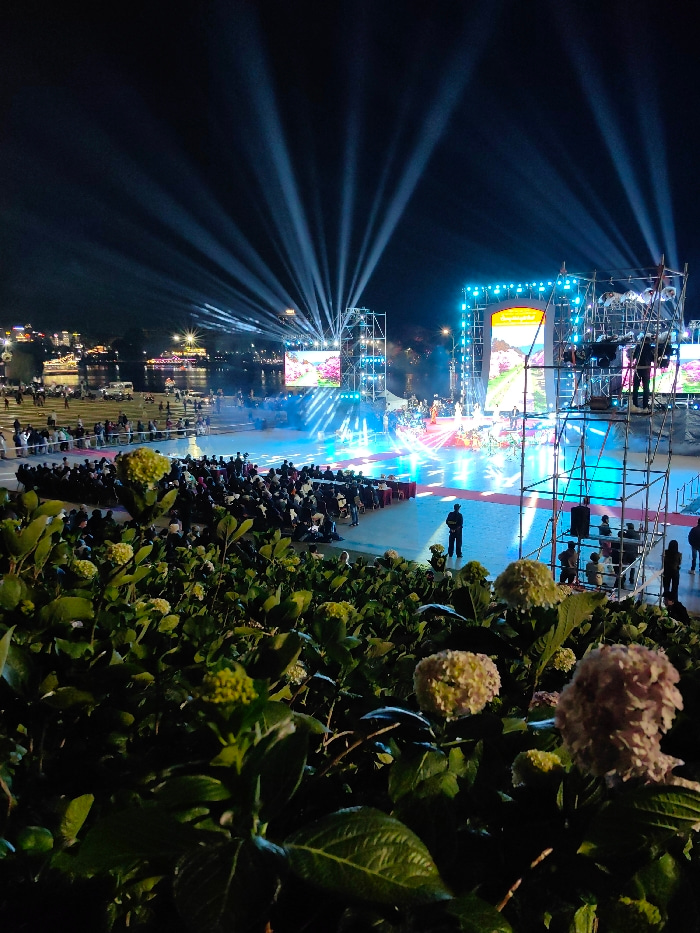 An outdoor nighttime event is captured at Xuan Huong Lake in Da Lat, Vietnam. The foreground is dominated by lush green foliage, specifically hydrangea bushes with some light-colored blossoms and buds…read more