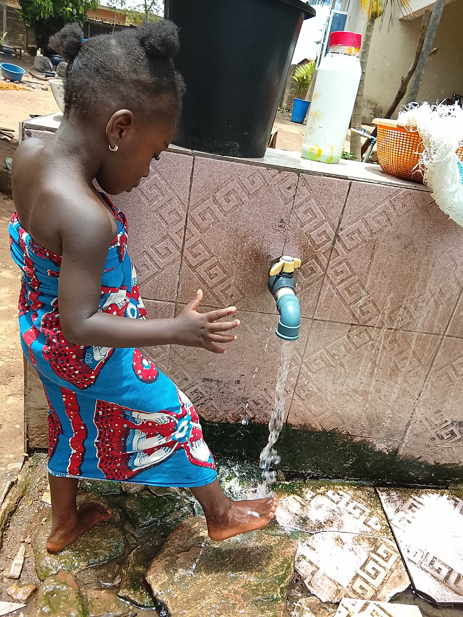 A young girl with braided hair styled in two buns, wearing a blue and red patterned wrap dress, stands at an outdoor tap in Akwanga, Nigeria. She is facing the tap and putting her hands and bare feet…read more