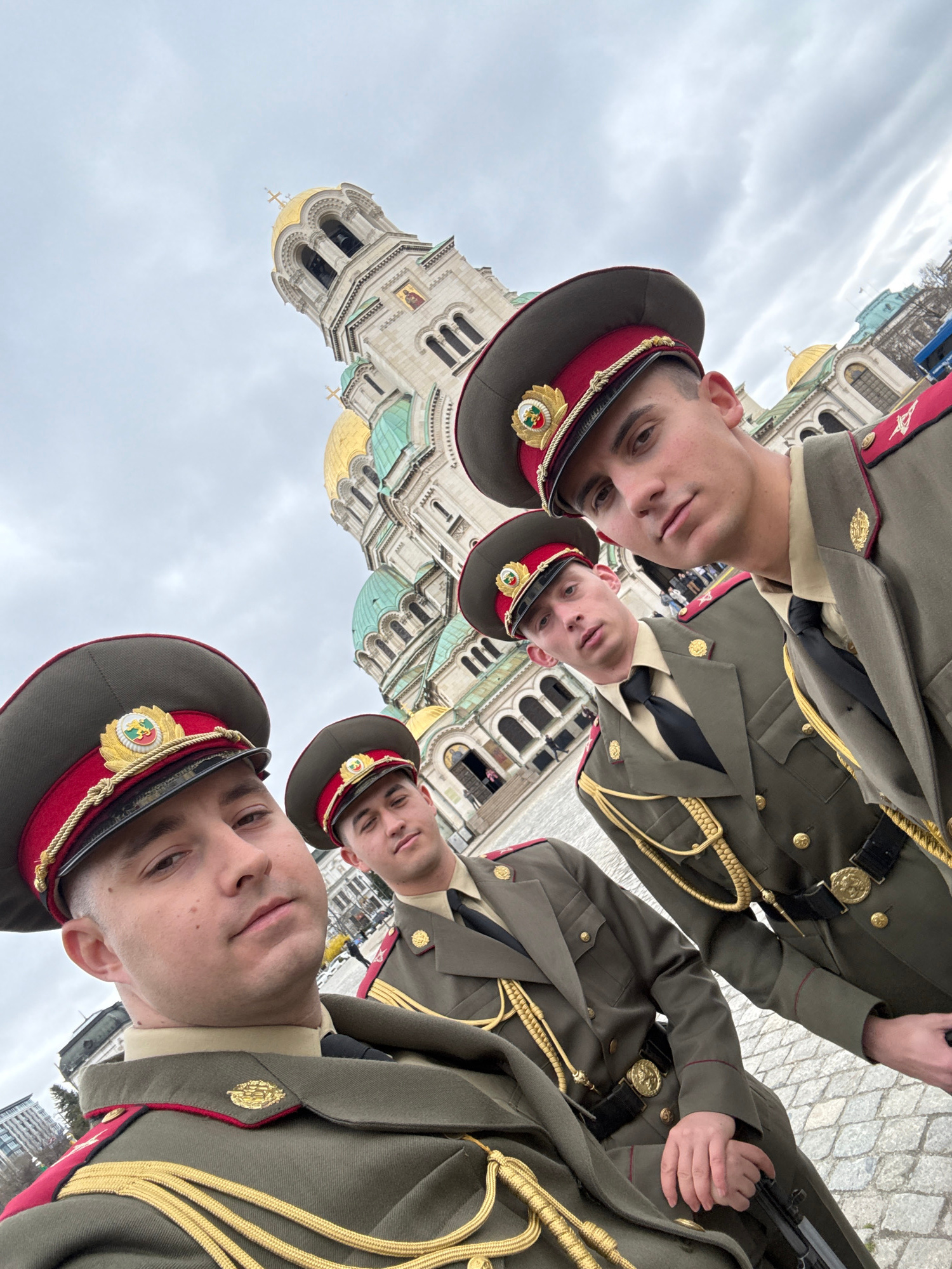Four men stand in military uniforms with peaked caps, against a backdrop featuring the Alexander Nevsky Cathedral in Sofia, Bulgaria. The sky is overcast. Two men hold rifles.