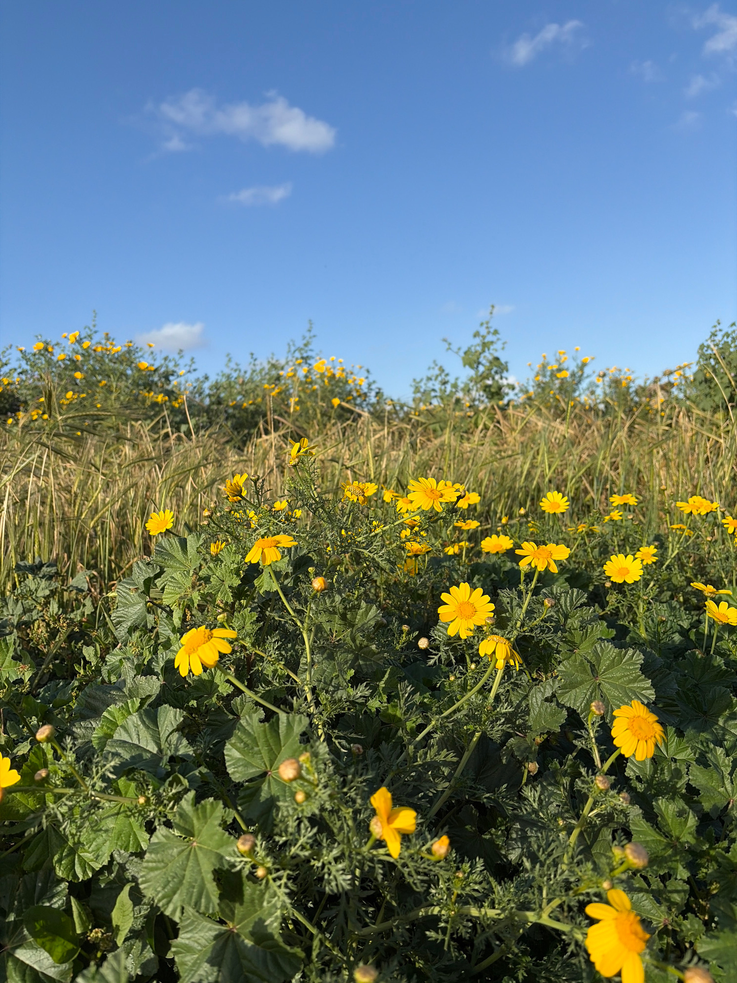 The image depicts a field of yellow flowers under a blue sky with scattered clouds. The flowers are in varying states of bloom, interspersed with green foliage and some dry grass. The scene is likely…read more