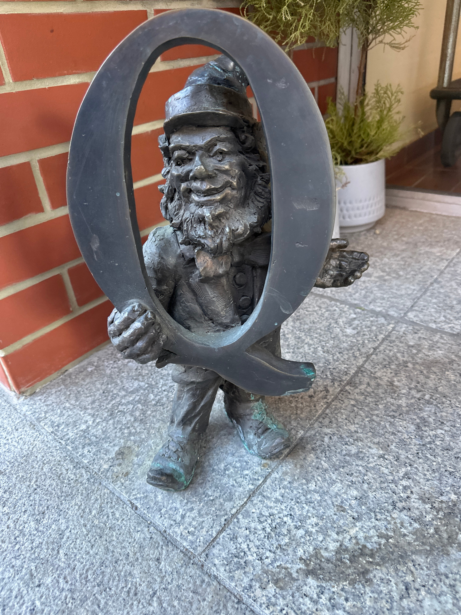 The image shows a bronze dwarf statue, one of the many "krasnale" scattered throughout Wrocław, Poland. This particular dwarf appears to be struggling while trapped inside a large metal fish symbol. T…read more