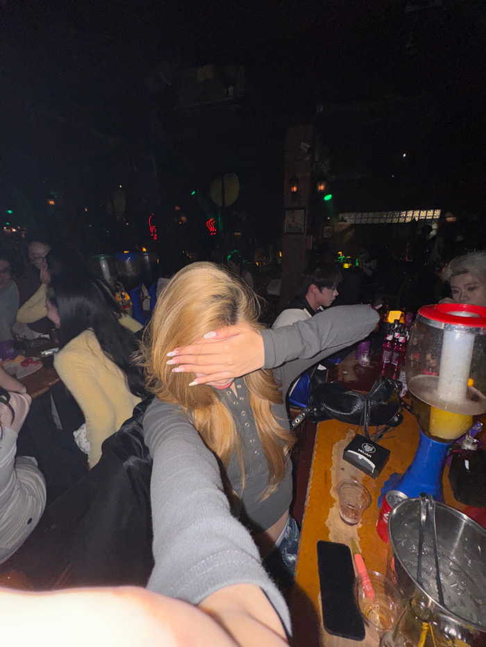 The image captures a nighttime scene inside what appears to be a dimly lit bar or club in Liangjiang, China. The perspective is from close to a table or bar, looking across a gathering of people. In…read more