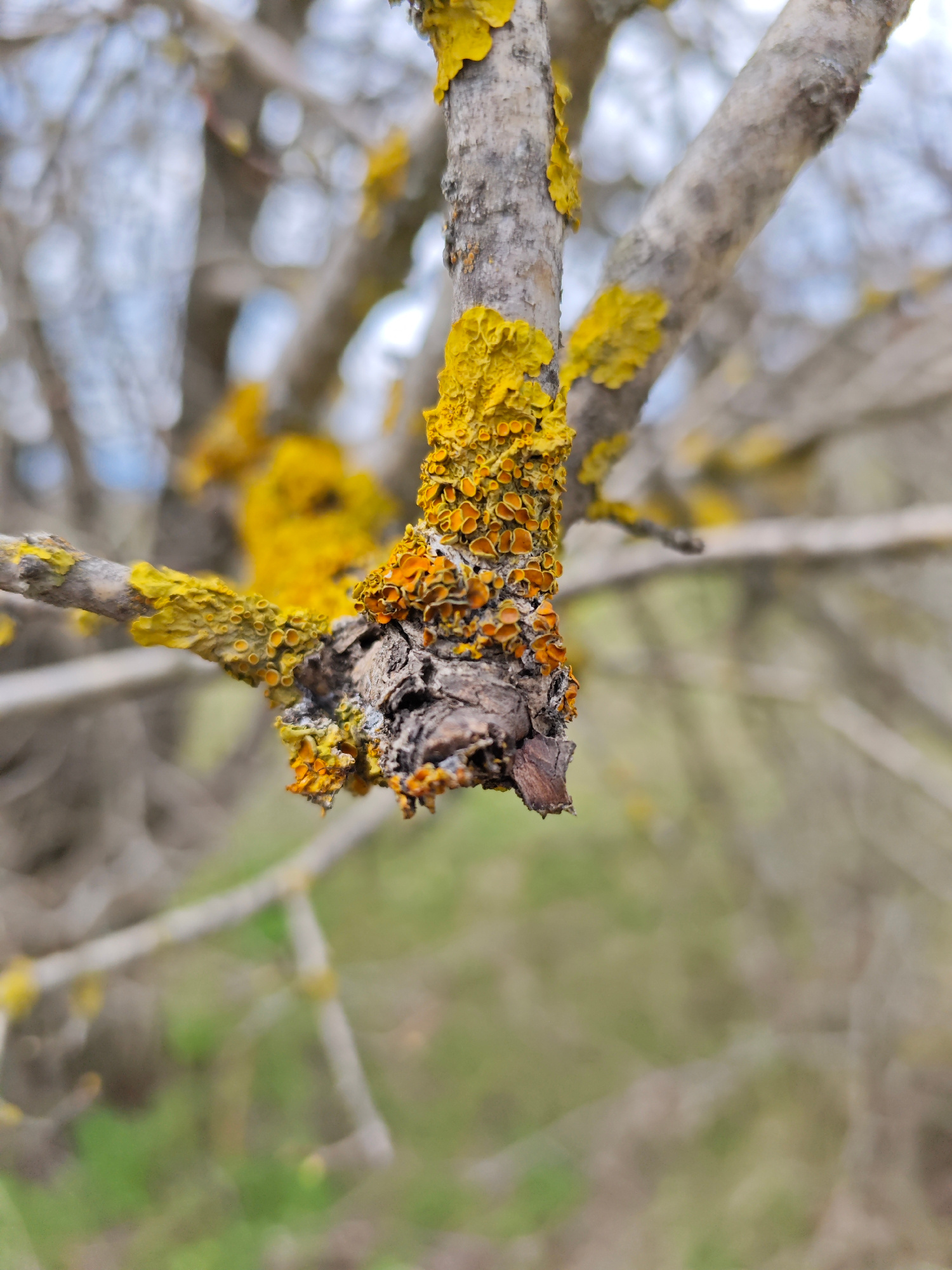 A close-up photograph shows a tree branch covered in yellow and orange lichen. The branch is bare and appears to be dead, with some bark peeling. The background is blurred, but shows a green area with…read more