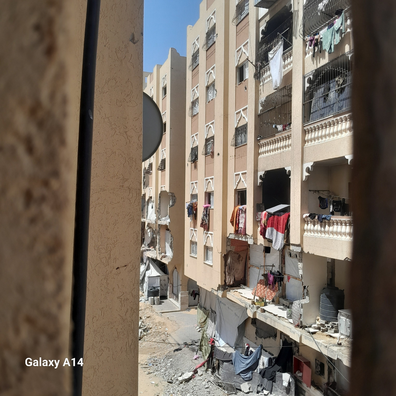 The image, taken from a high vantage point, depicts a multi-story building in a state of partial ruin. The building is primarily tan in color with repetitive window designs, some featuring decorative…read more