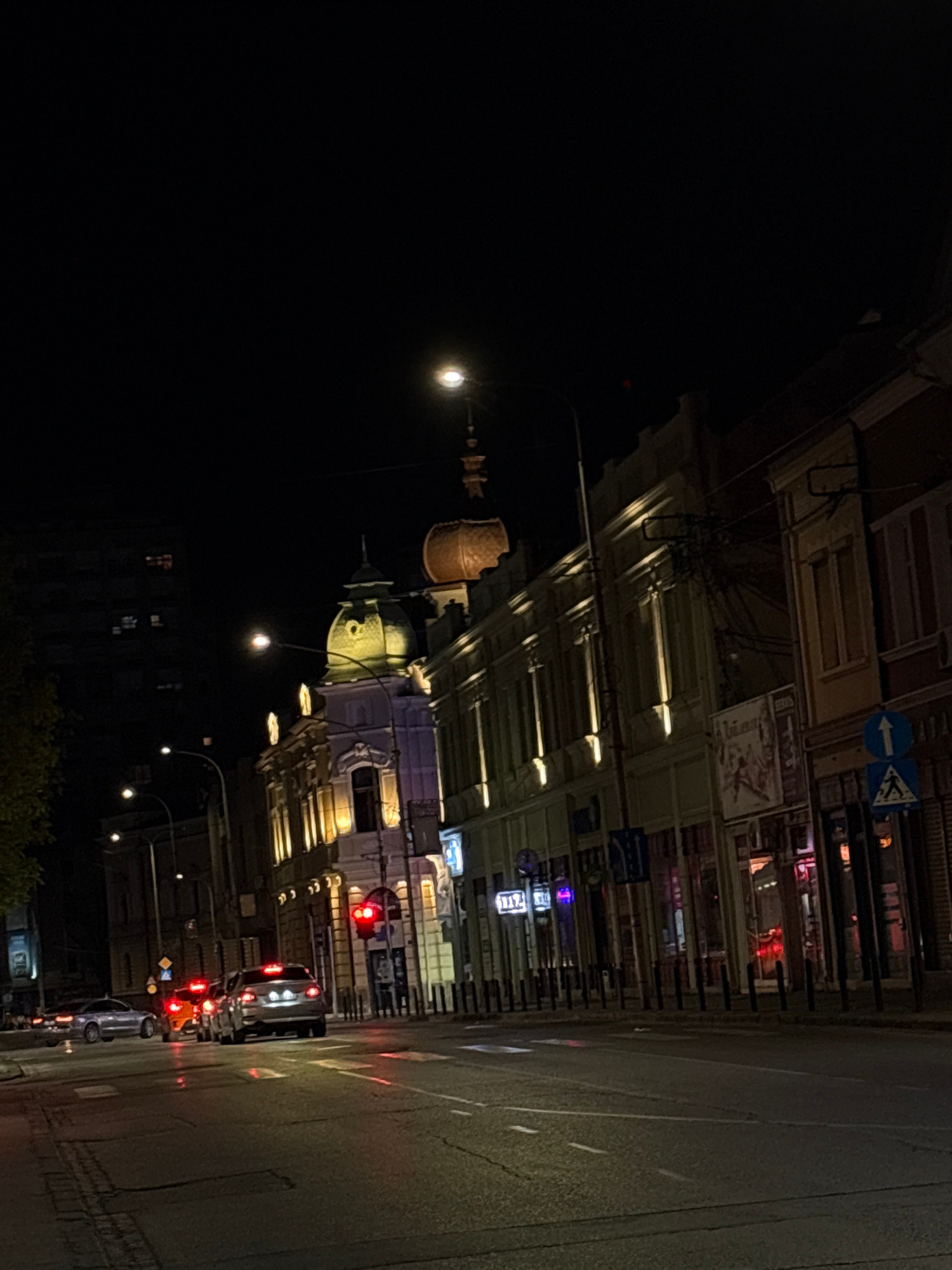 The image shows a nighttime street scene in Kragujevac, Serbia. The camera is positioned looking upwards along a street lined with buildings. Streetlights illuminate the architecture, including a domeβ¦read more