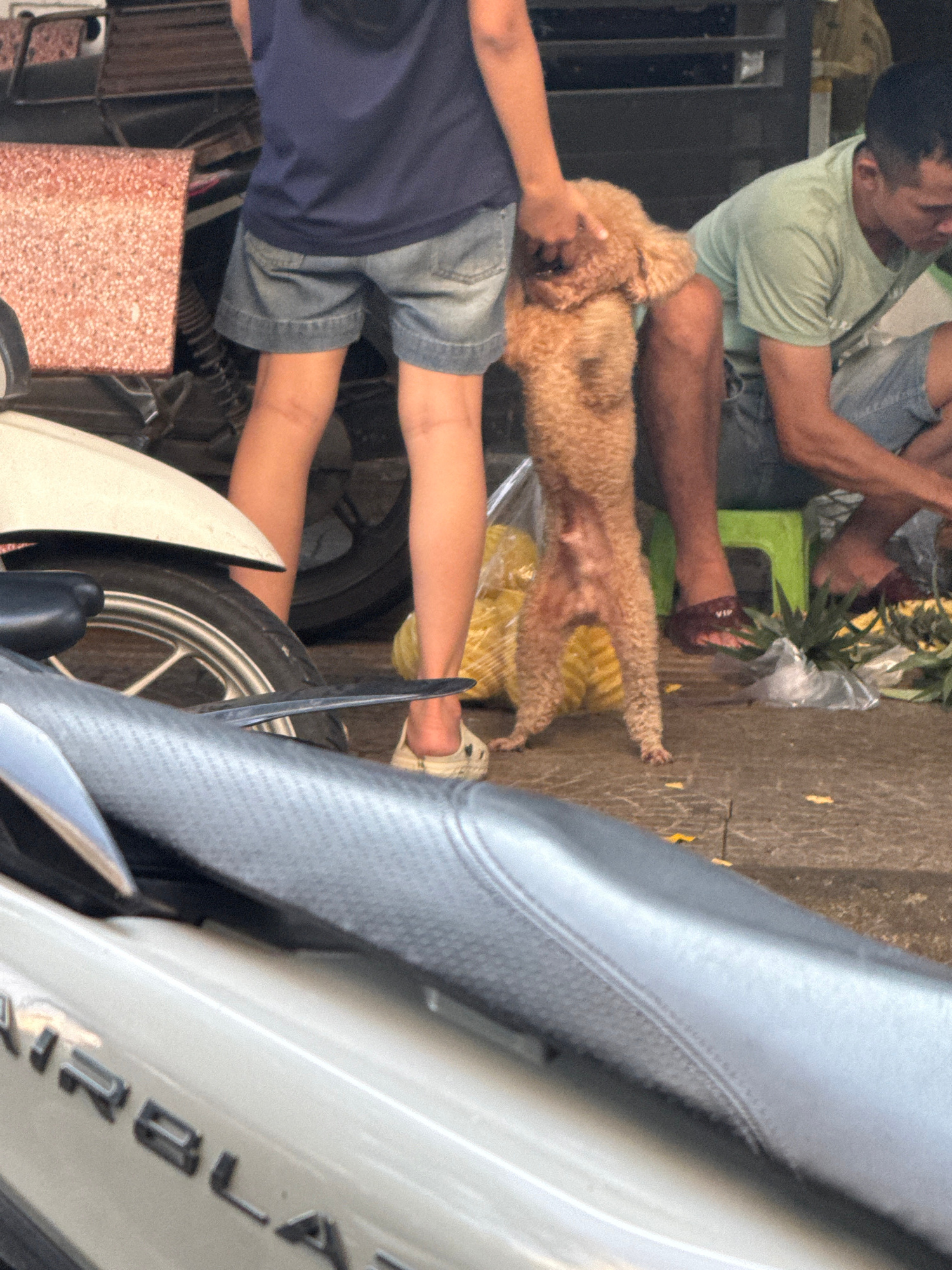 Captured from a vertical angle, the image depicts a casual street scene, potentially in Đà Nẵng, Vietnam. In the upper left, a man in a light green t-shirt and denim shorts sits on a green stool. A do…read more