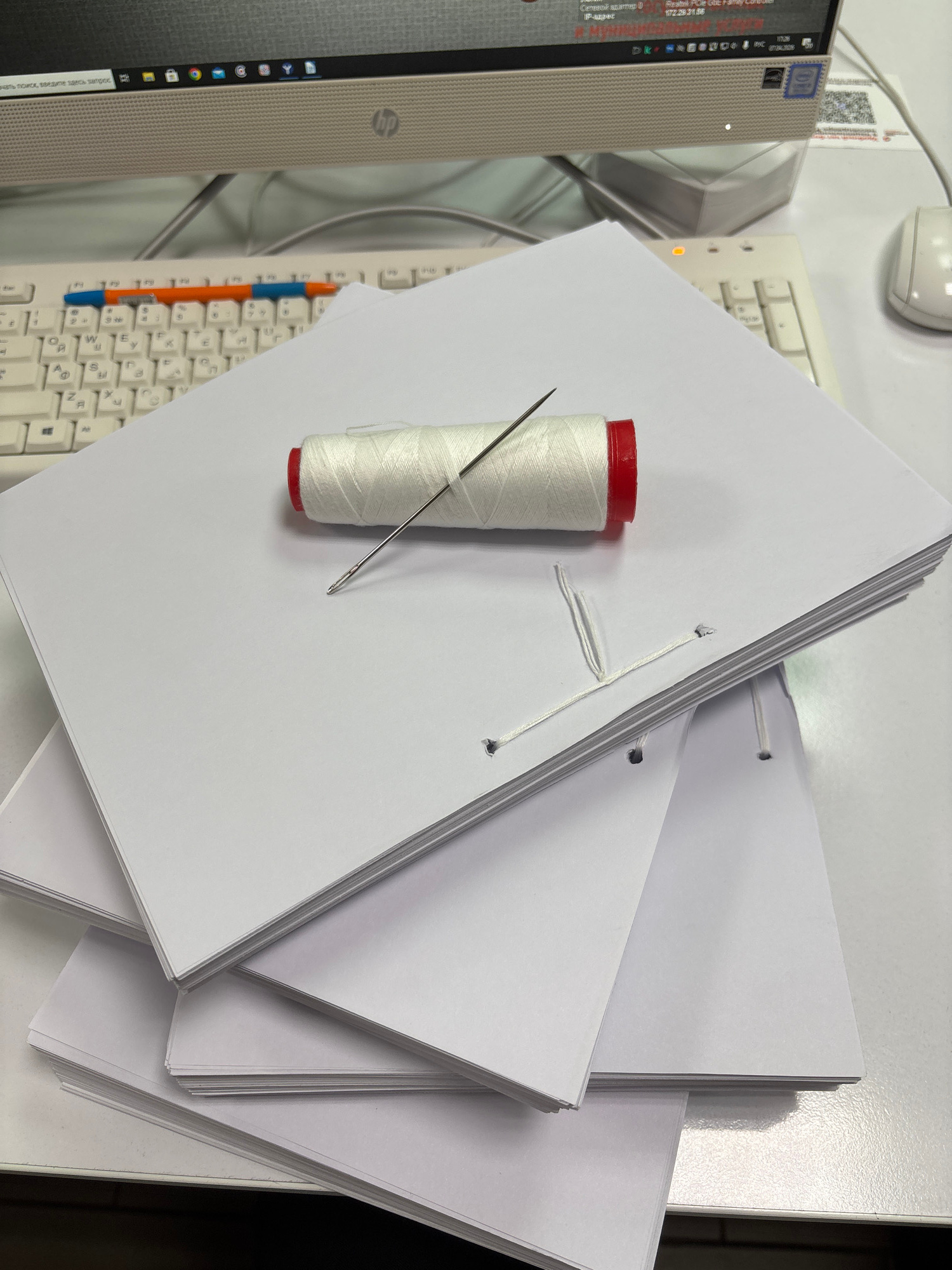 A top-down, brightly-lit shot depicts a stack of blank, white, hole-punched papers stacked somewhat haphazardly on a white desk surface, close to a white keyboard and a light gray computer monitor. A…read more