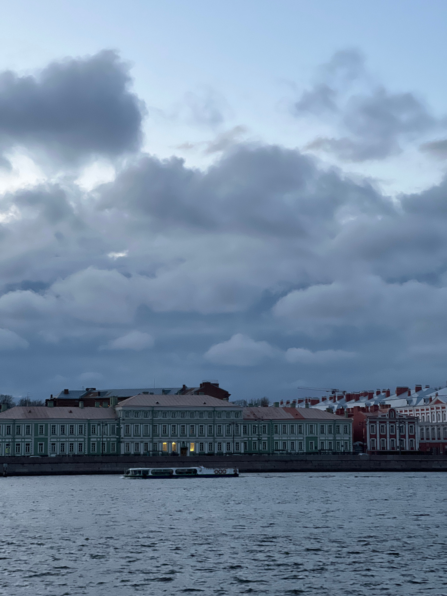 The image depicts a cityscape in Saint Petersburg, Russia, likely taken from across the Neva River. The sky is overcast with heavy, textured clouds covering most of the frame. Along the riverbank, a r…read more