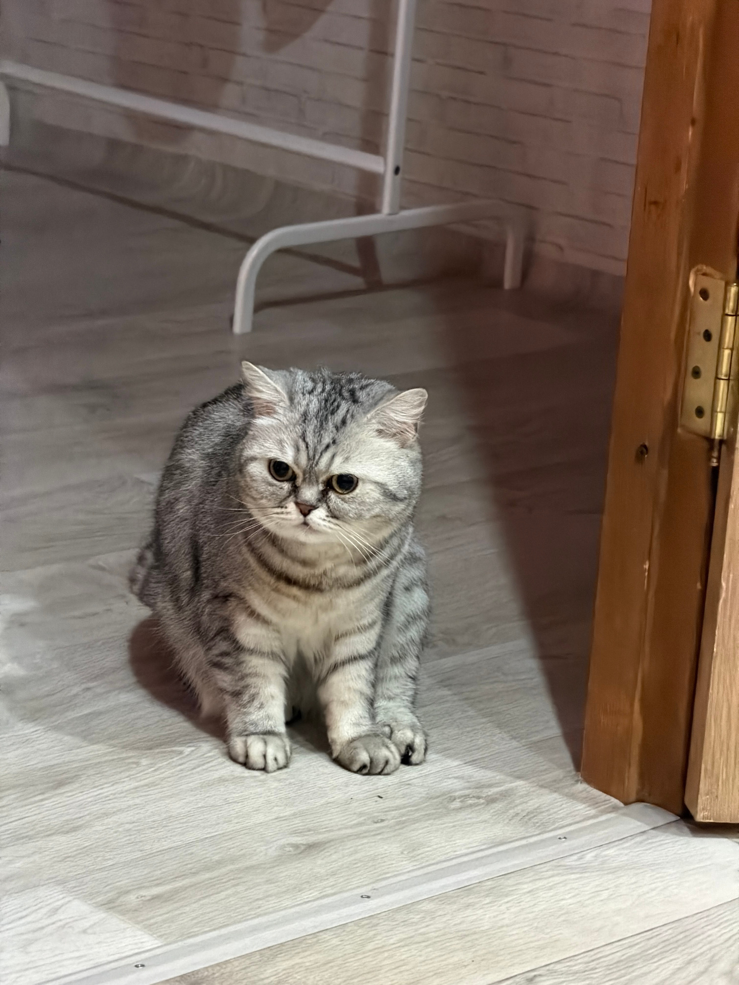 A gray tabby cat sits on a light gray, wood-patterned floor. A white metal chair frame is visible in the background. A wooden table with brass hinges is located above the cat. The scene is indoors. Thβ¦read more