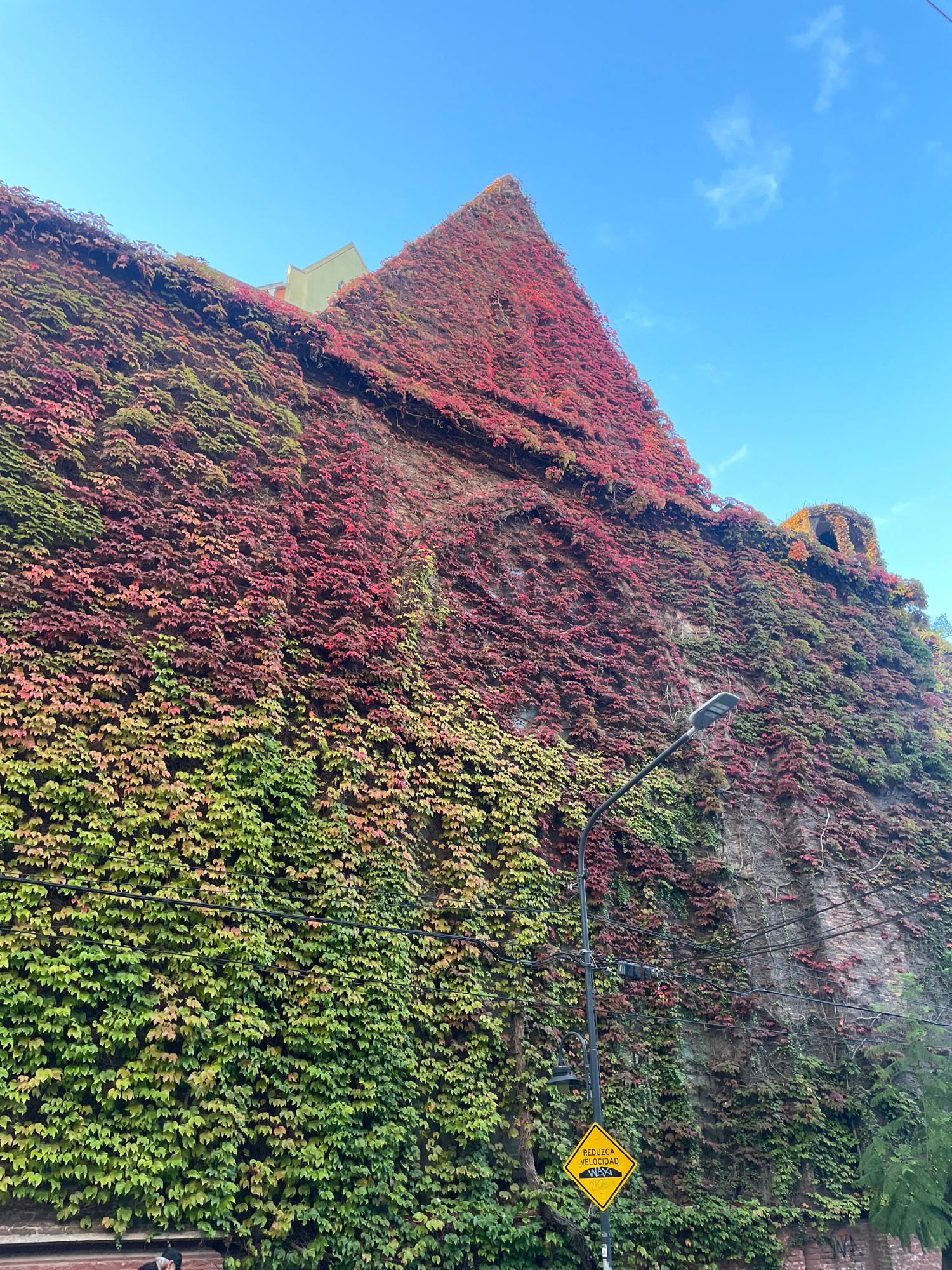 An outdoor scene is captured at an upward angle, dominated by a tall building wall almost entirely covered in dense climbing plants. The image, which appears to be a rotated portrait shot presented in…read more