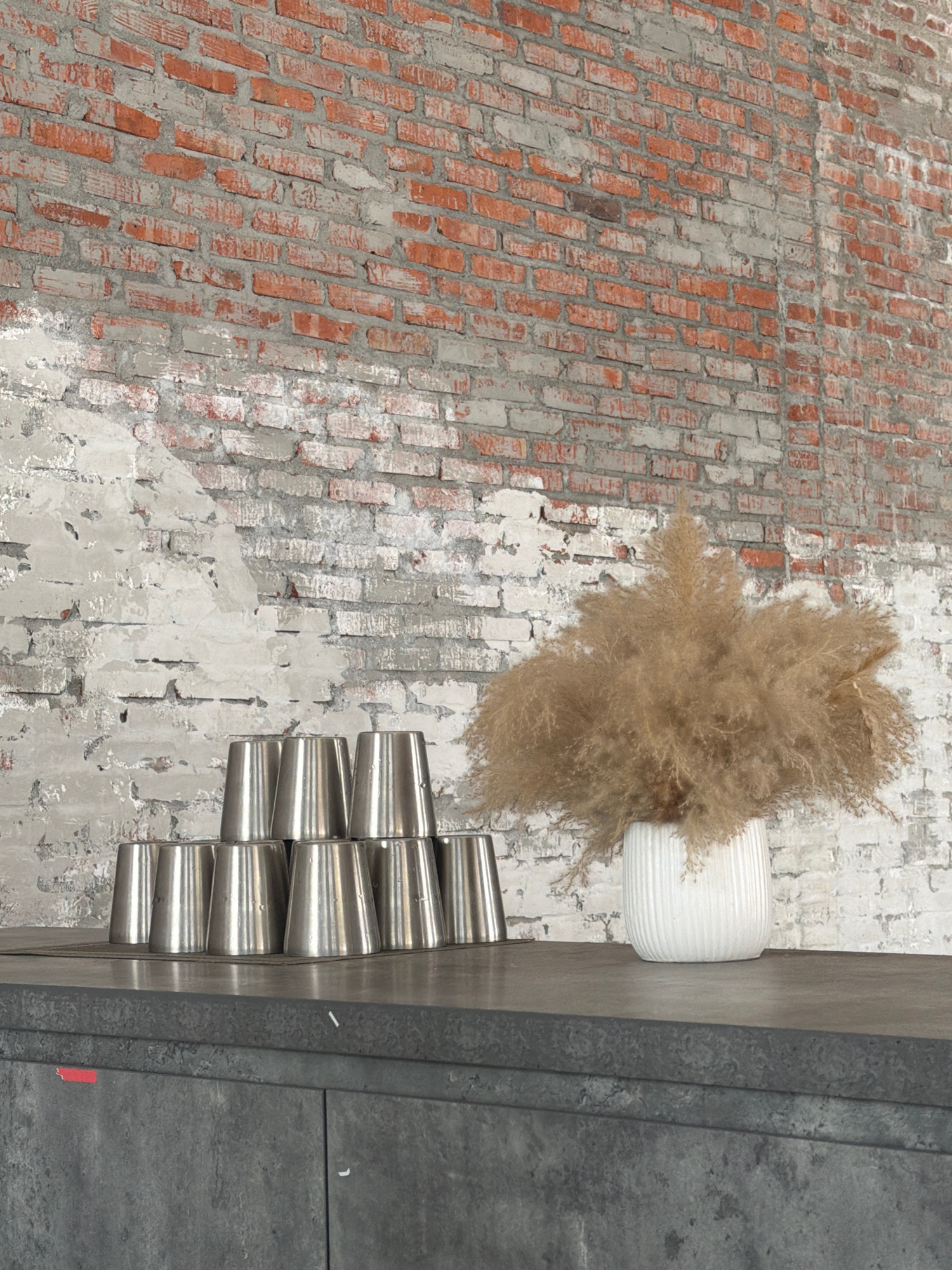 A high-angle shot shows a partially whitewashed brick wall on the left transitioning to a more uniformly whitewashed wall with exposed brick remnants. A white cylindrical vase holding dried foliage si…read more