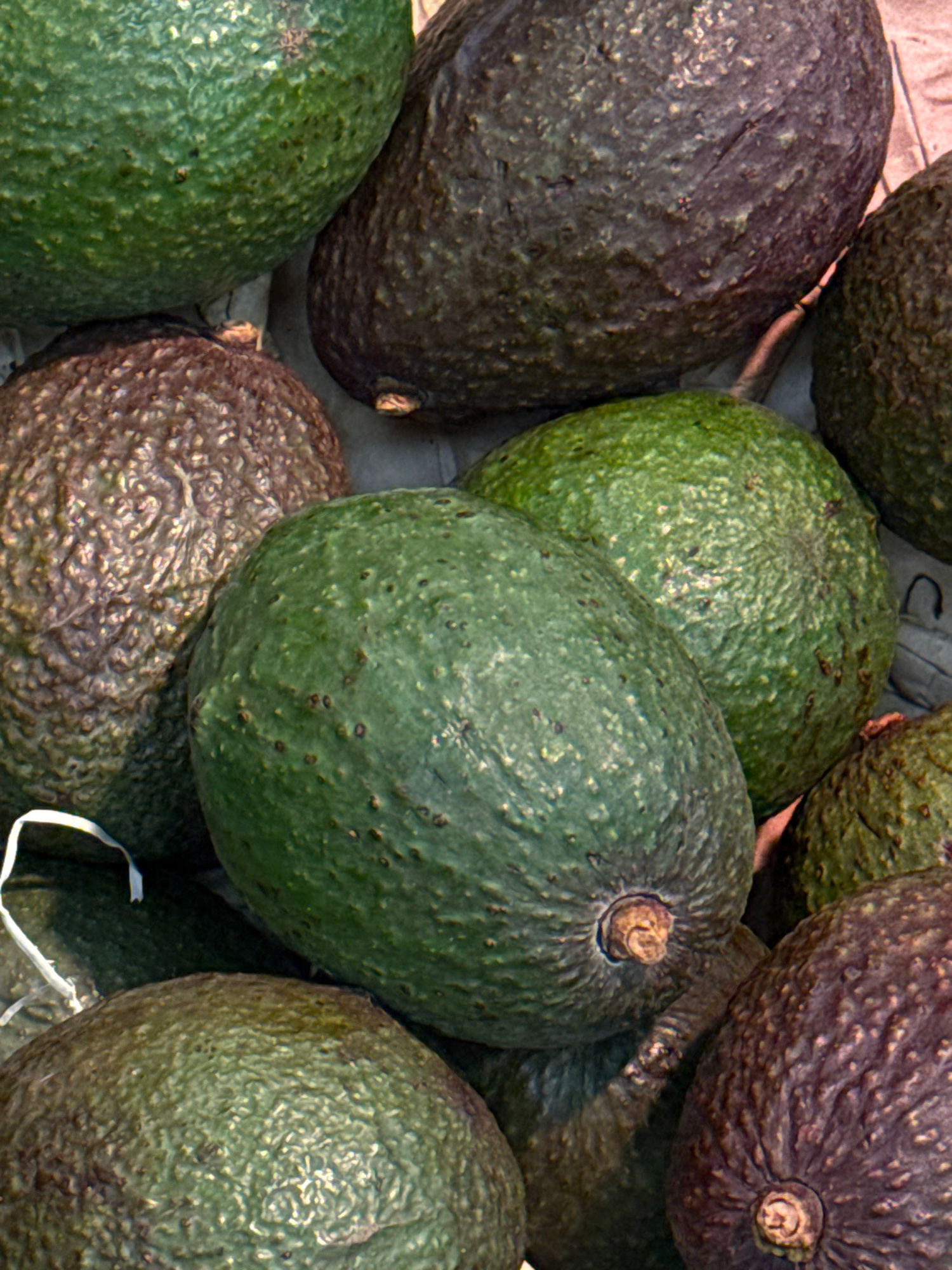 The image shows a close-up of a collection of avocados. The avocados vary in color from green to dark brown and have a textured skin. The avocados are closely packed together, filling the frame. The b…read more