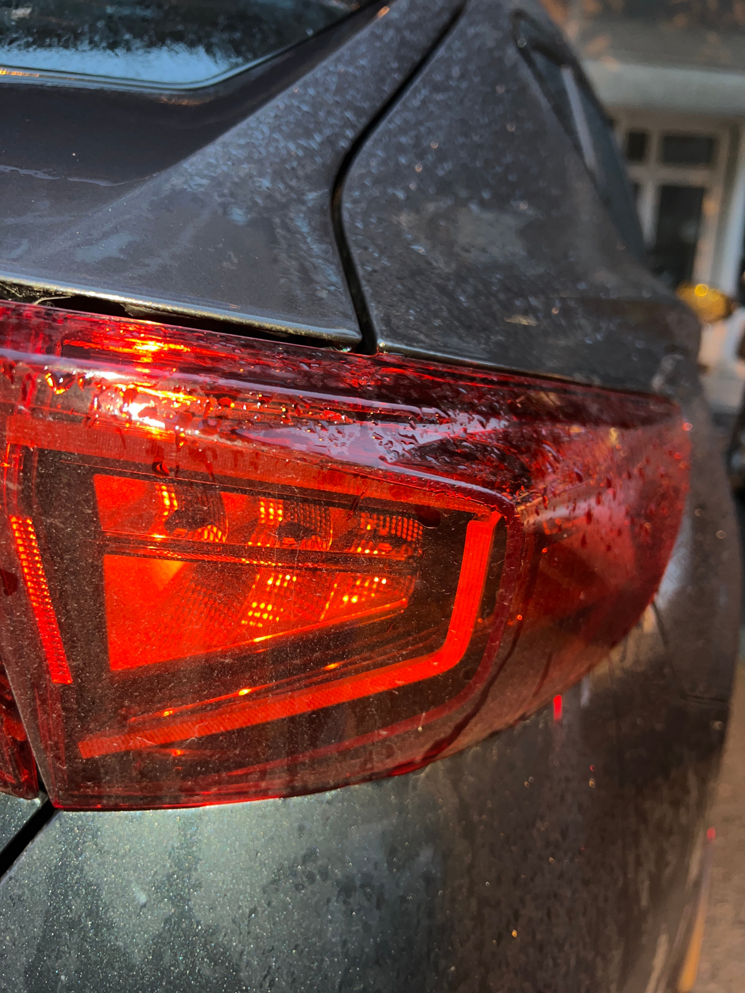 The image shows the rear taillight of a gray car. The taillight is red and features a geometric design. Water droplets are visible on the surface of the taillight. The car appears to be dirty, as evid…read more