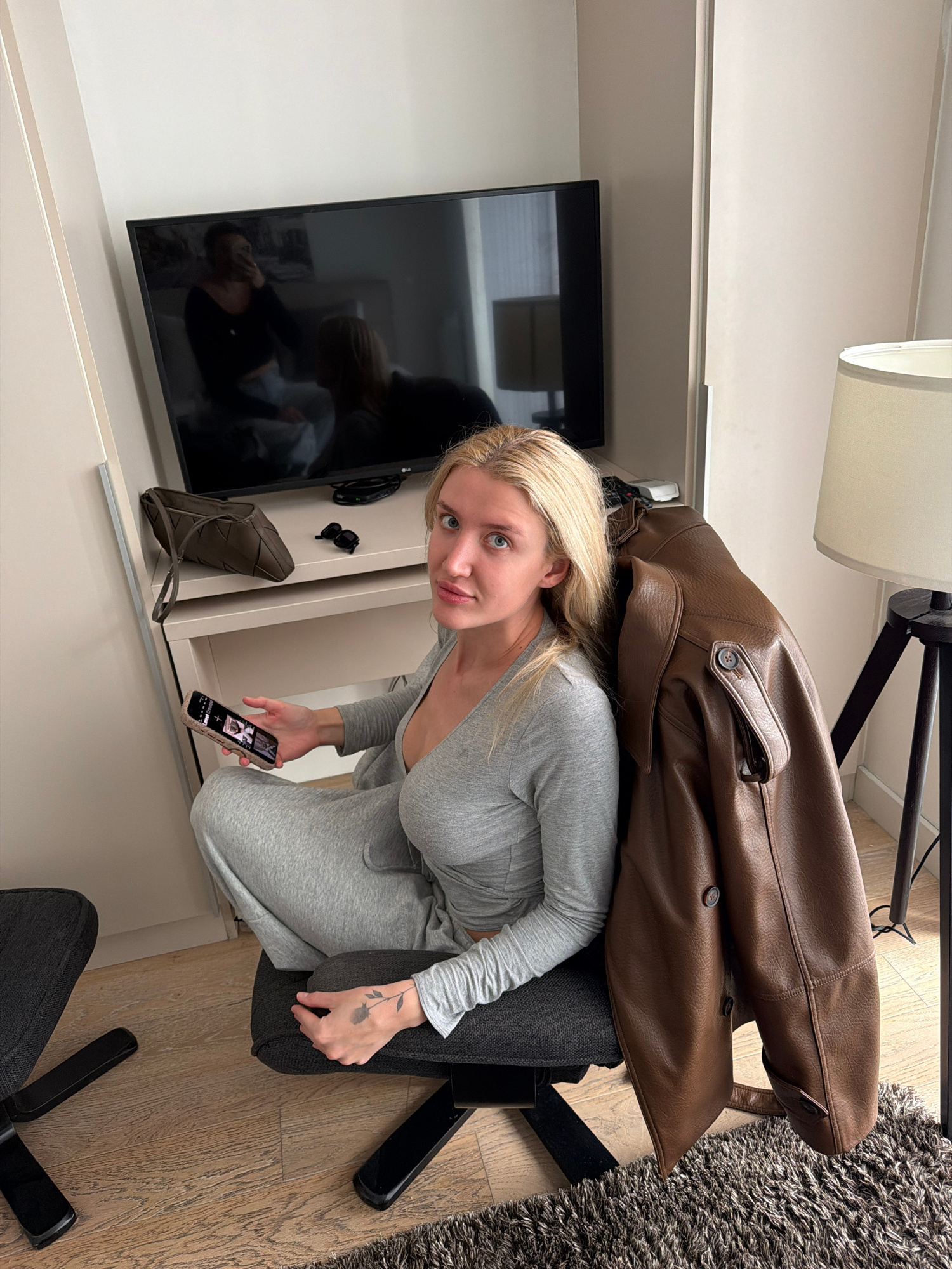 The image depicts an indoor scene in Belgrade, Serbia. A blonde female, appearing to be in her 20s or 30s, is seated on a dark grey office chair with a black five-star base. She wears a long-sleeved,…read more