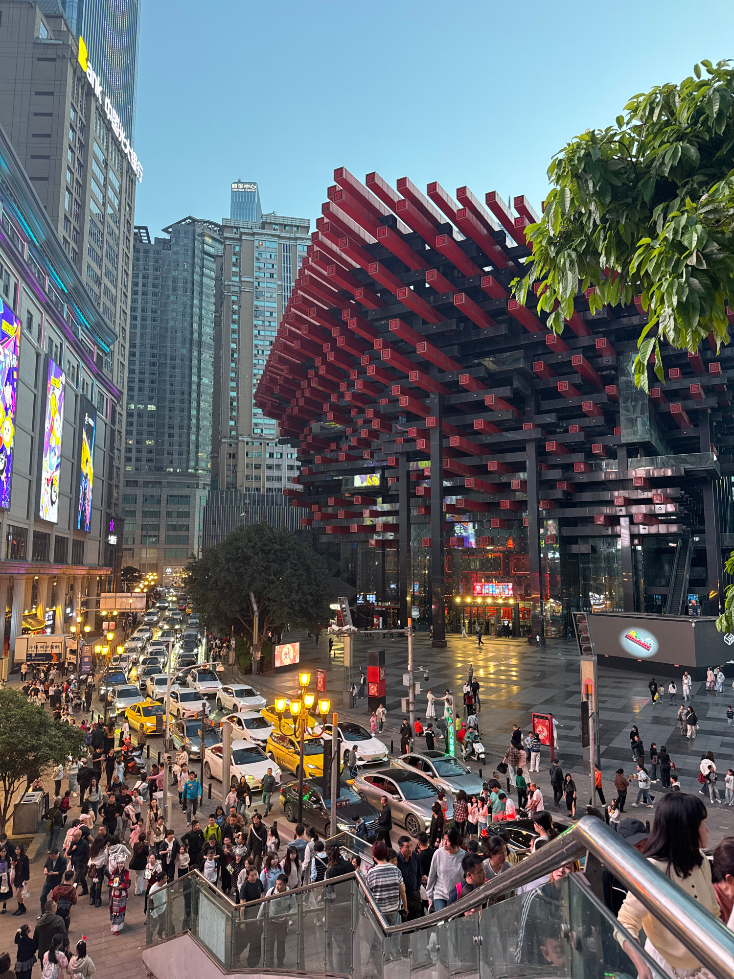 The image depicts a bustling urban scene in Yuzhong District, Chongqing, China. A distinctive architectural structure composed of numerous red and black columns dominates the upper-left portion of theβ¦read more