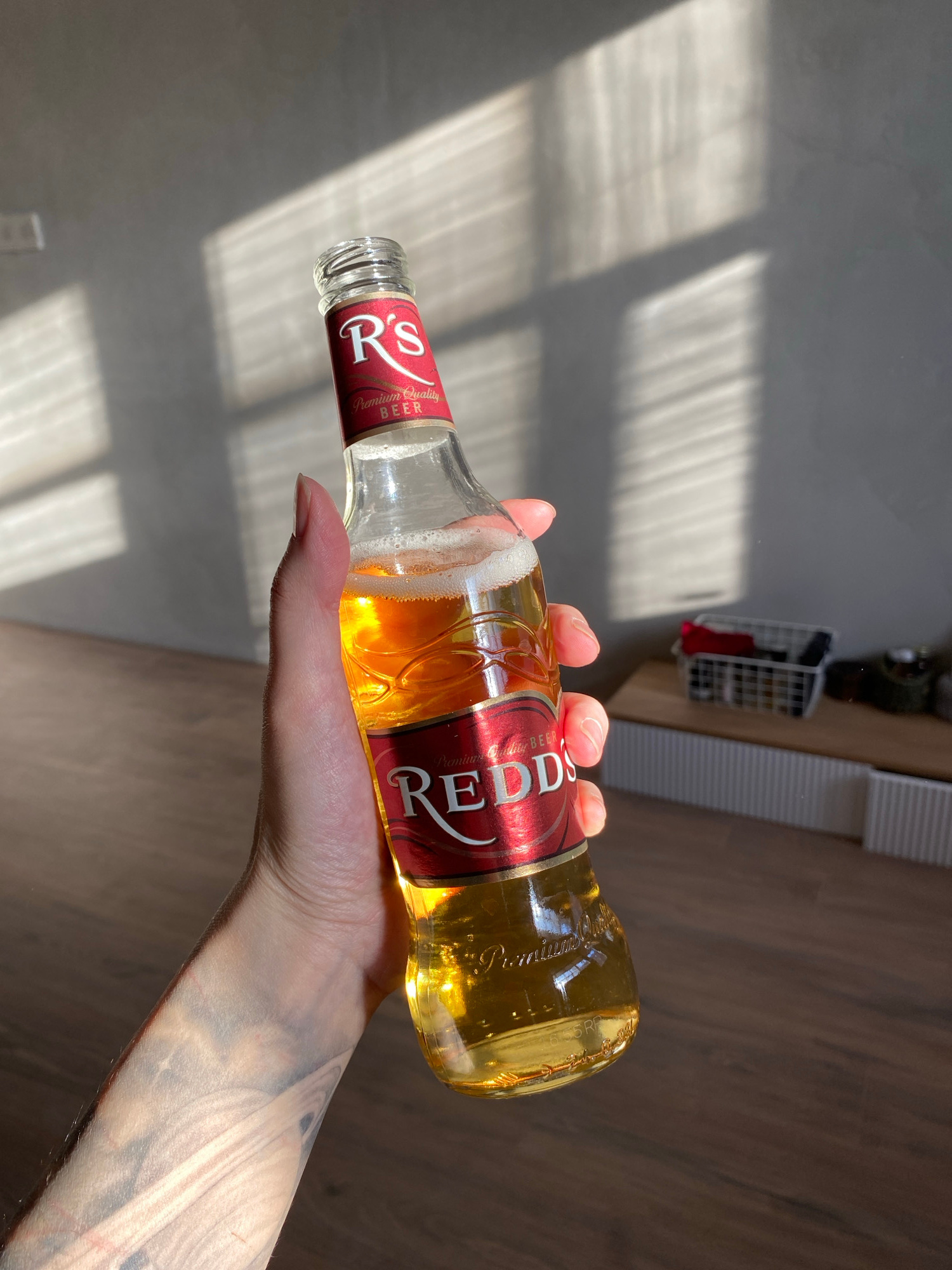 A hand is holding a partially consumed bottle of Redd's Premium Quality Beer. The bottle is tilted, with the neck pointing towards the left of the frame. The hand and the bottle are illuminated by sun…read more