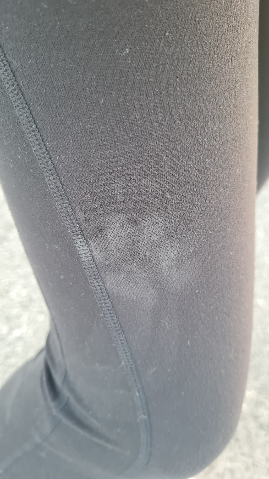 The image shows a close-up of a person's leg wearing black leggings. The leggings have a lighter, faded patch on the thigh area. The fabric is textured and shows stitching at the seam. The background…read more