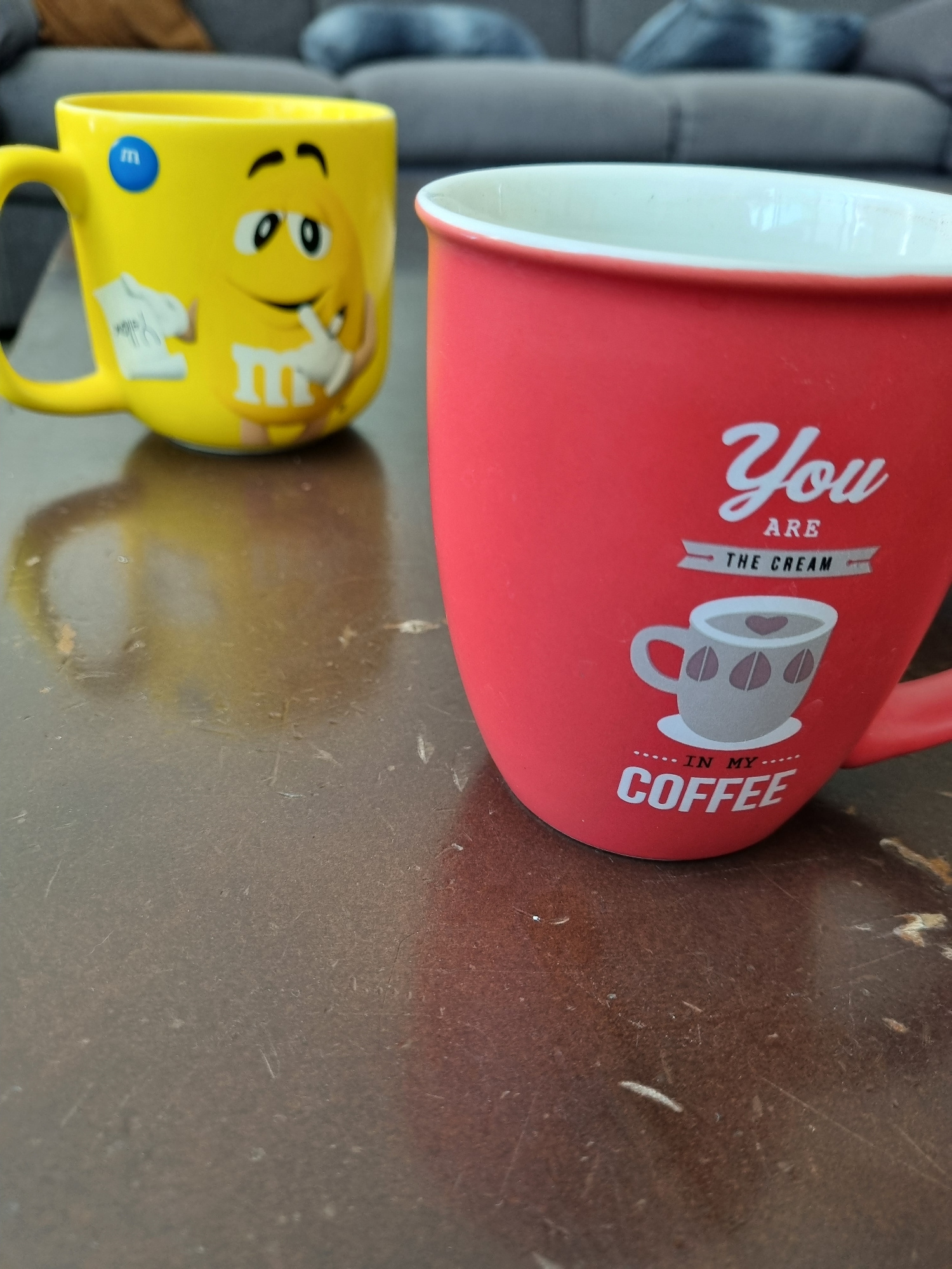 The image displays two ceramic mugs positioned on a dark, textured surface, likely a table, in an indoor setting in San Bernardino Tlaxcalancingo, Mexico. The surface is dark brown or grey, showing no…read more