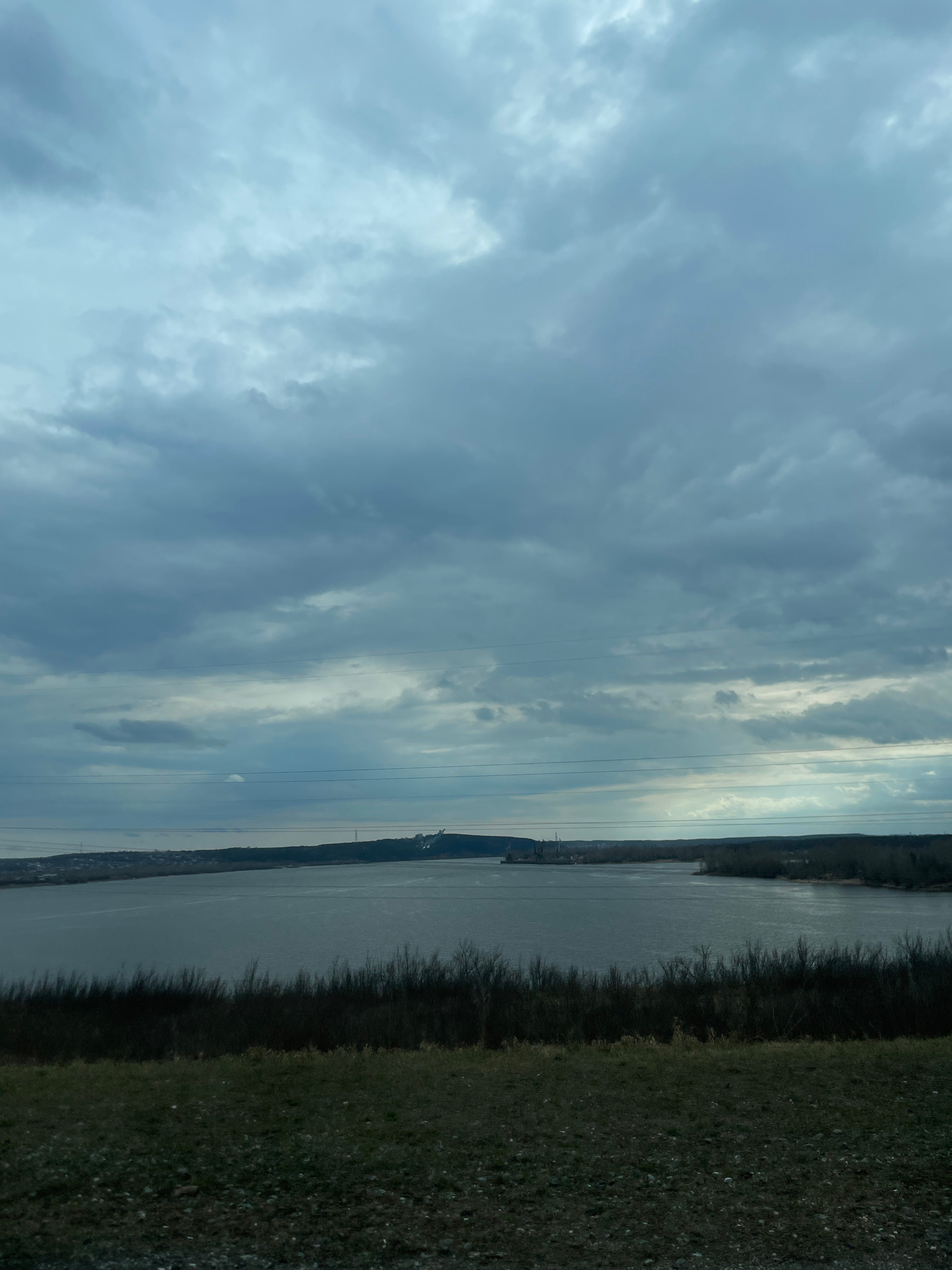 The image depicts a landscape in Chaikovsky, Russia. A body of water, likely the Kama River, stretches across the middle ground of the frame. The river's surface appears somewhat reflective. Along the…read more