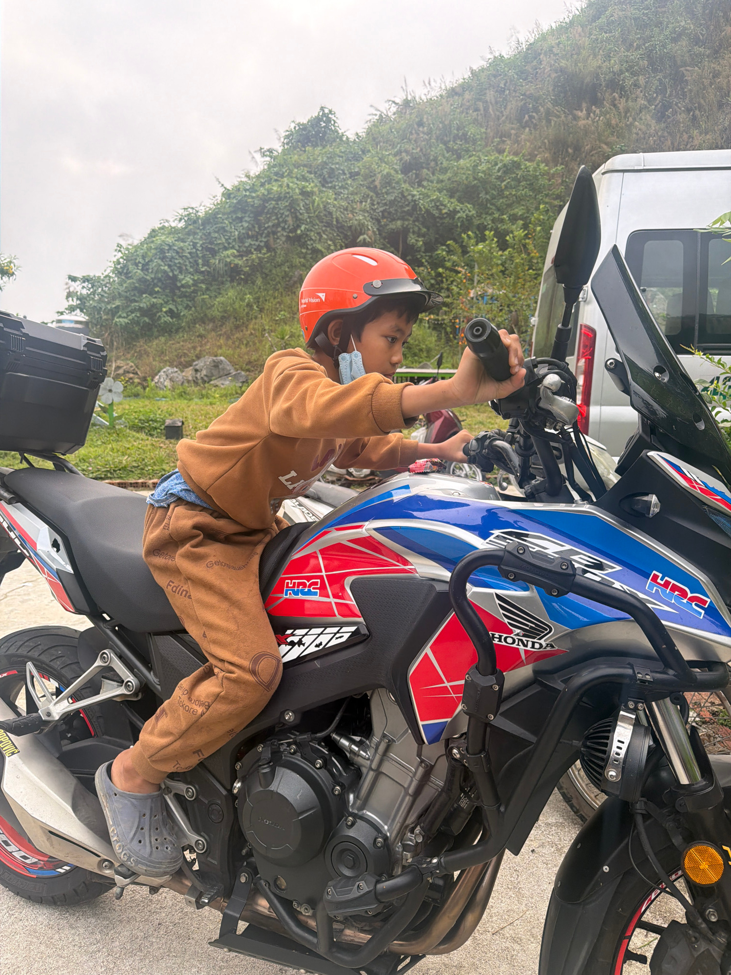 A young child wearing an orange helmet, a brown top, and brown pants is sitting on a motorcycle. The motorcycle is red, white, and blue with the Honda logo. The child is holding the handlebars. The ba…read more